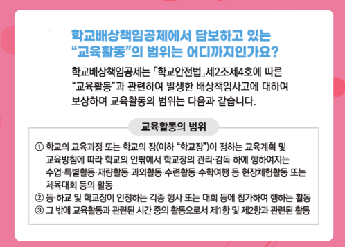 학교배상책임사고에서 담보하고 있는 “교육활동”의 범위는 어디까지인가요?