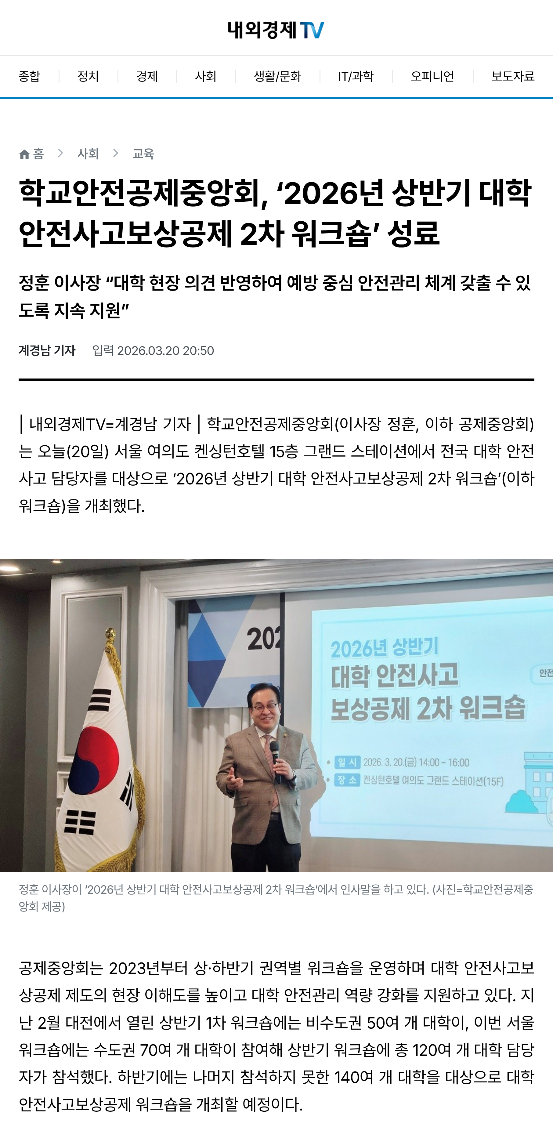 □ [내외경제TV] (2026.03.20.) 학교안전공제중앙회, ‘2026년 상반기 대학 안전사고보상공제 2차 워크숍’ 성료 https://www.nbntv.co.kr/news/articleView.html?idxno=4020029