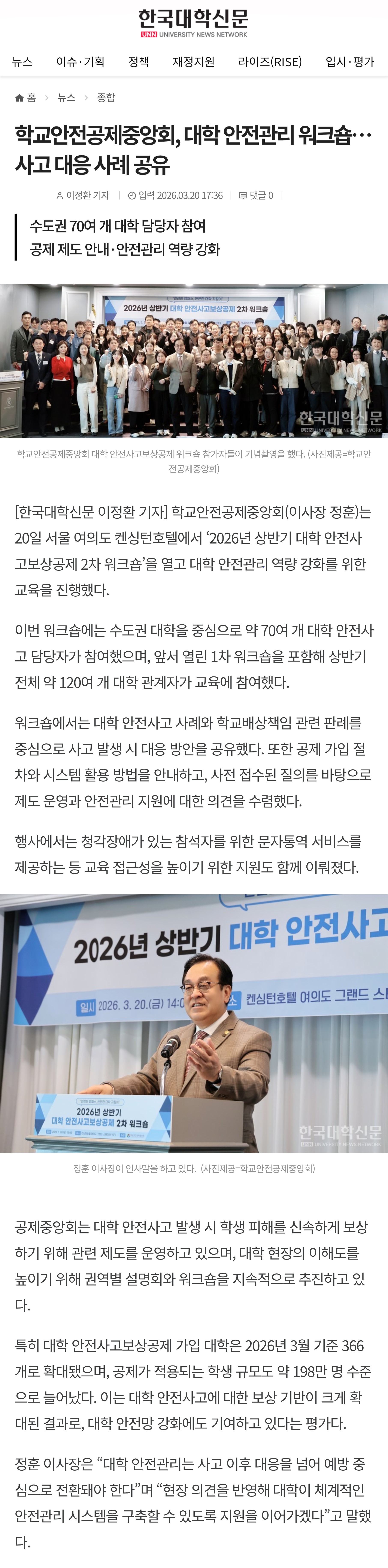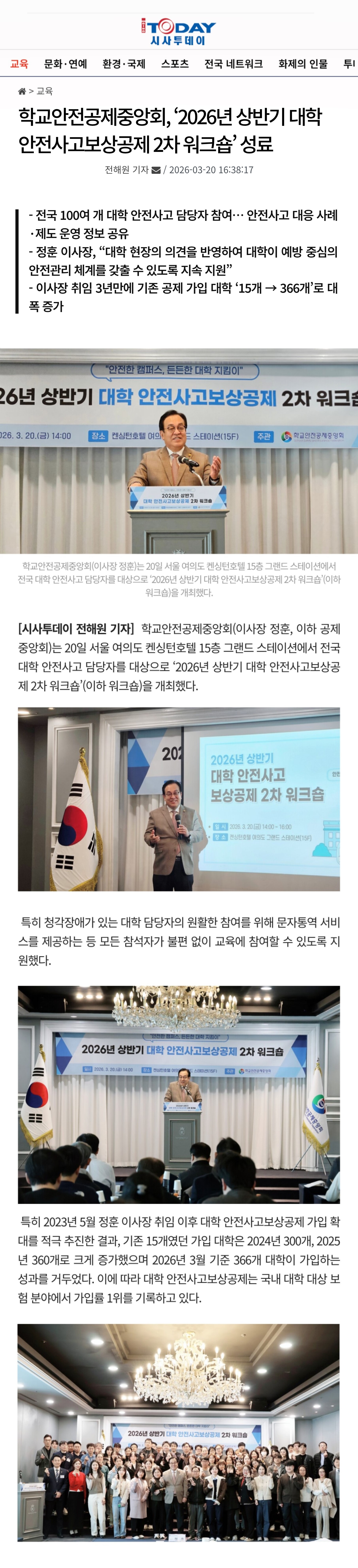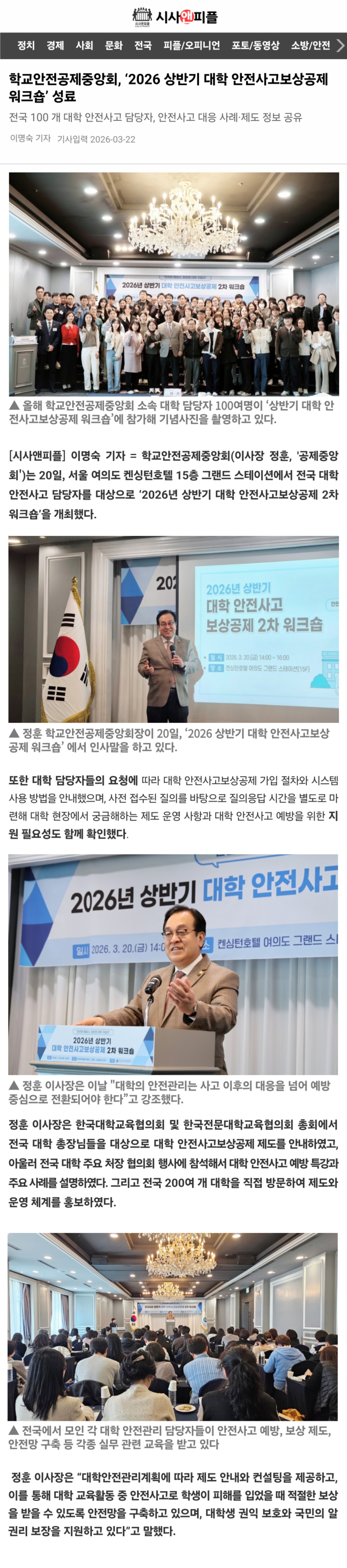 □ [시사앤피플] (2026.03.22.) 학교안전공제중앙회, ‘2026 상반기 대학 안전사고보상공제 워크숍’ 성료 https://www.sisanpeople.com/14387