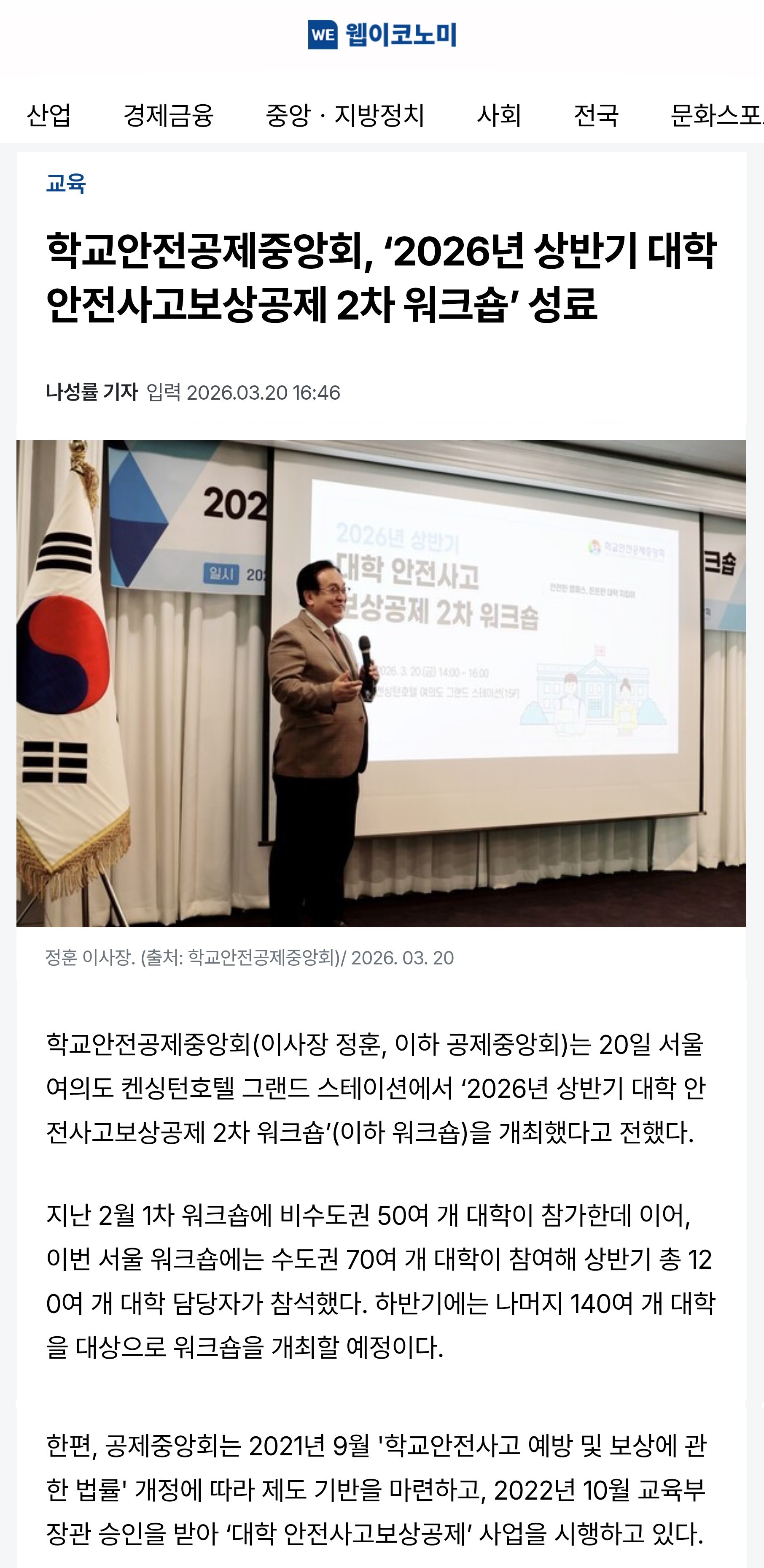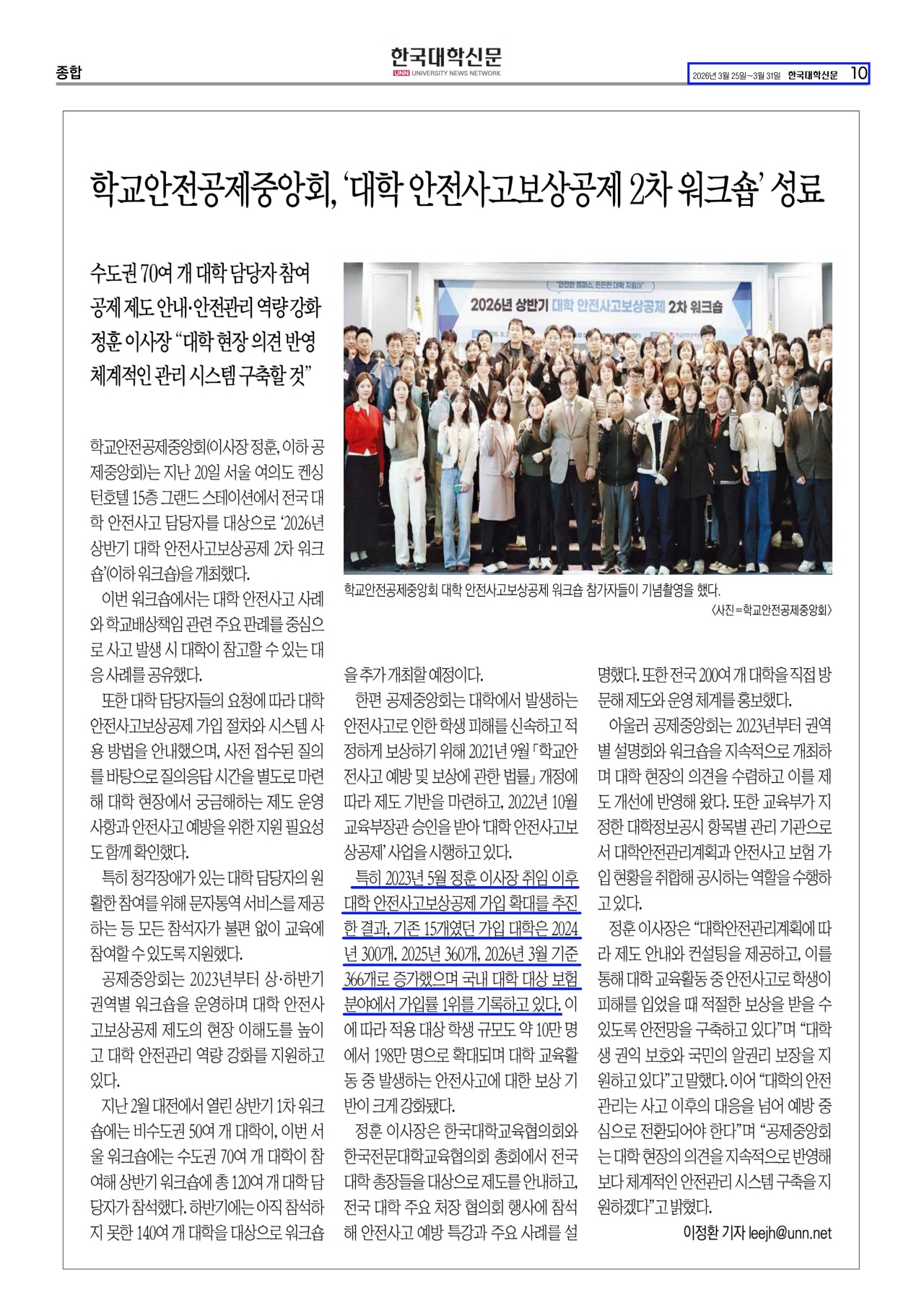 □ [웹이코노미] (2026.03.20.) 학교안전공제중앙회, ‘2026년 상반기 대학 안전사고보상공제 2차 워크숍’ 성료 https://www.webeconomy.co.kr/news/articleView.html?idxno=2112783