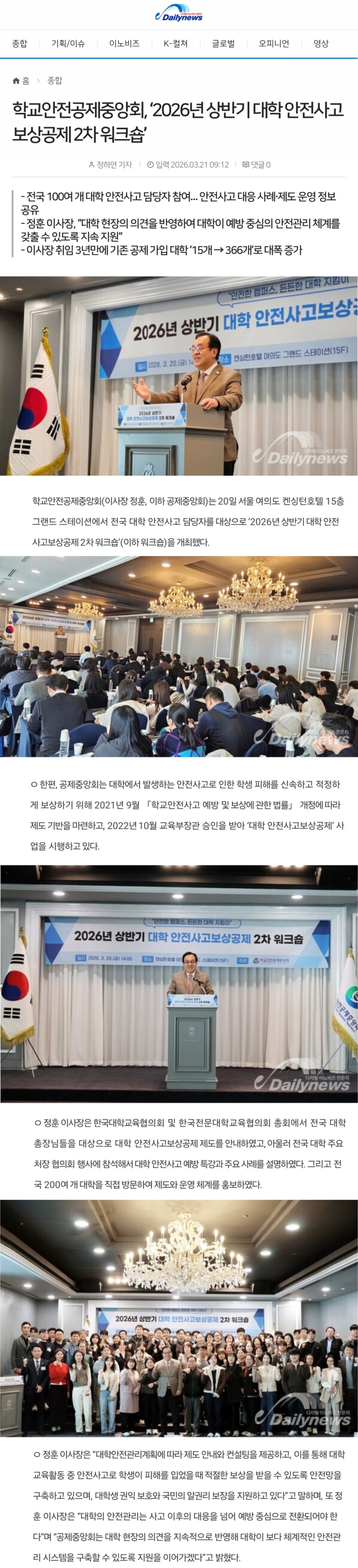 □ [데일리뉴스] (2026.03.21.) 학교안전공제중앙회, ‘2026년 상반기 대학 안전사고보상공제 2차 워크숍’ http://www.idailynews.co.kr/news/articleView.html?idxno=106531