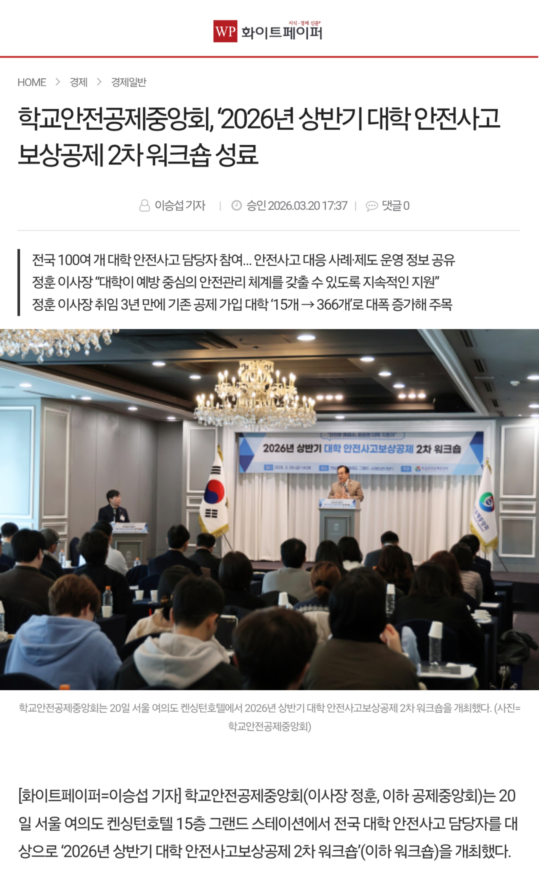 □ [화이트페이퍼] (2026.03.20.) 학교안전공제중앙회, ‘2026년 상반기 대학 안전사고보상공제 2차 워크숍’ 성료 http://www.whitepaper.co.kr/news/articleView.html?idxno=259821