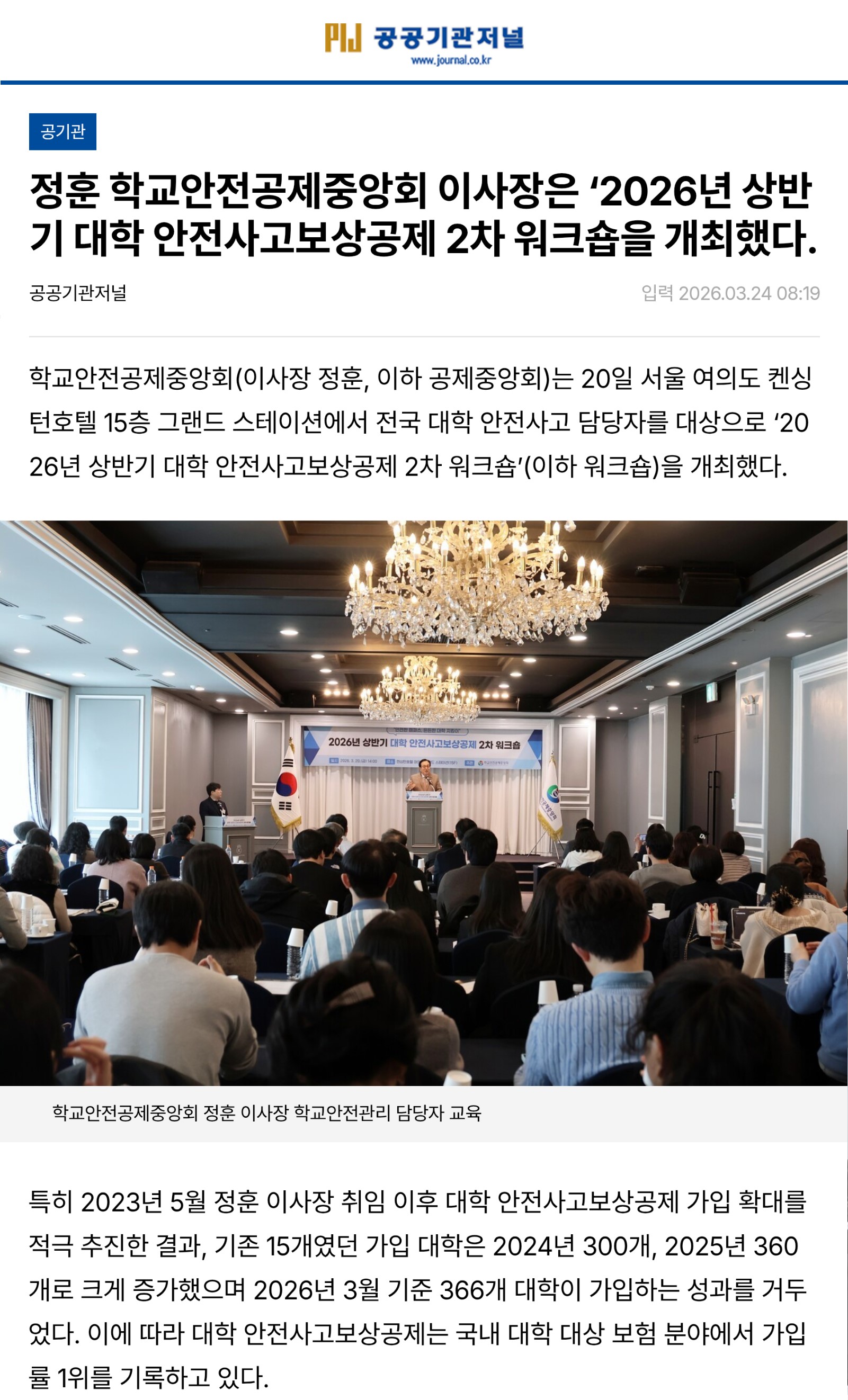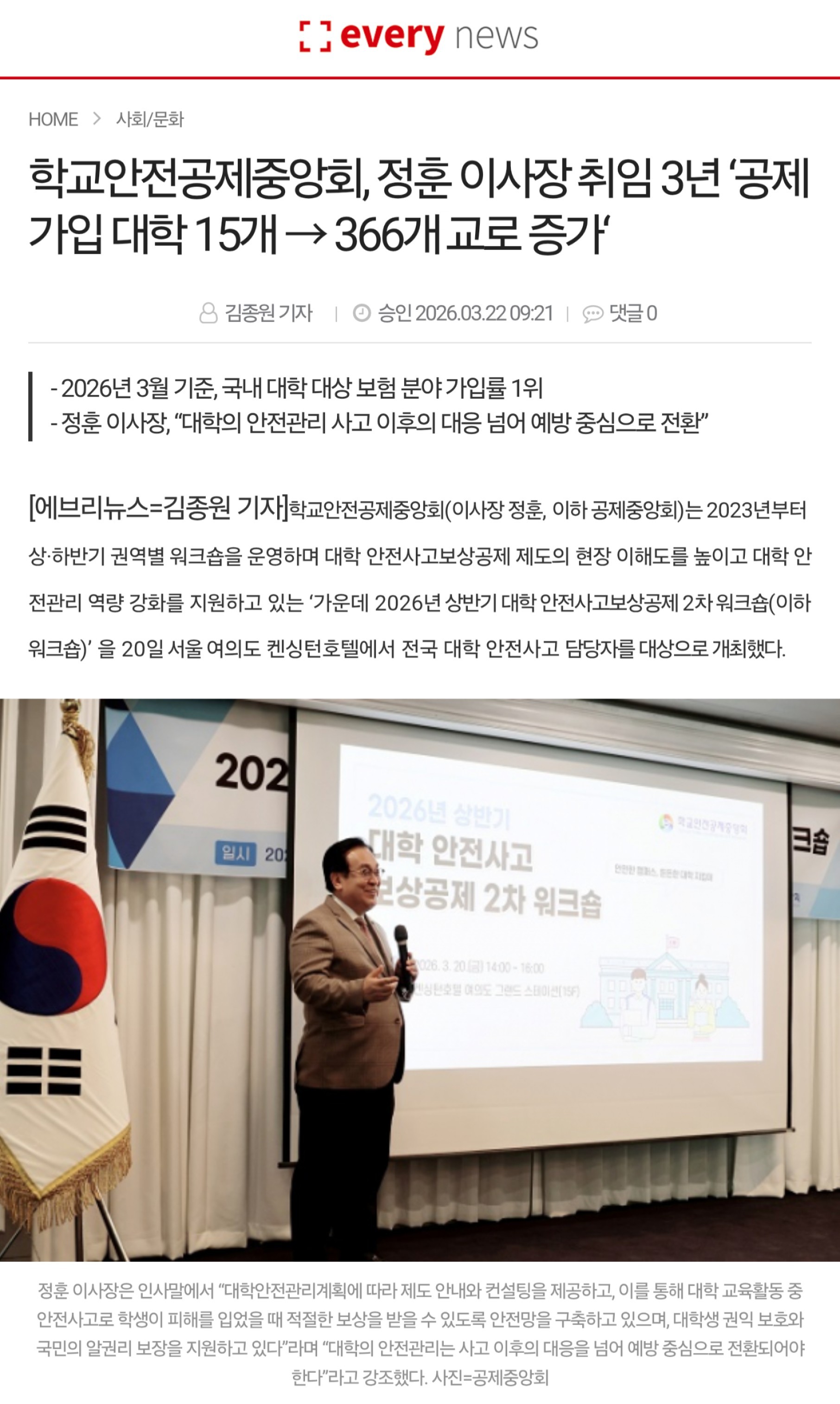 □ [에브리뉴스] (2026.03.22.) 학교안전공제중앙회, 정훈 이사장 취임 3년 ‘공제 가입 대학 15개 → 366개교로 증가‘ http://www.everynews.co.kr/news/articleView.html?idxno=47798