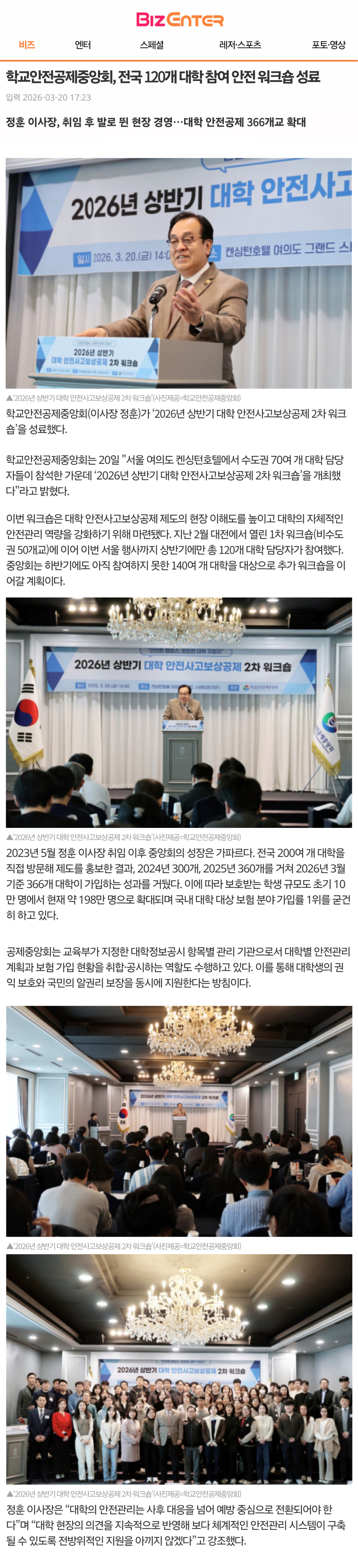 □ [비즈엔터] (2026.03.20.) 학교안전공제중앙회, 전국 120개 대학 참여 안전 워크숍 성료 https://m.enter.etoday.co.kr/view/news_view.php?varAtcId=294864