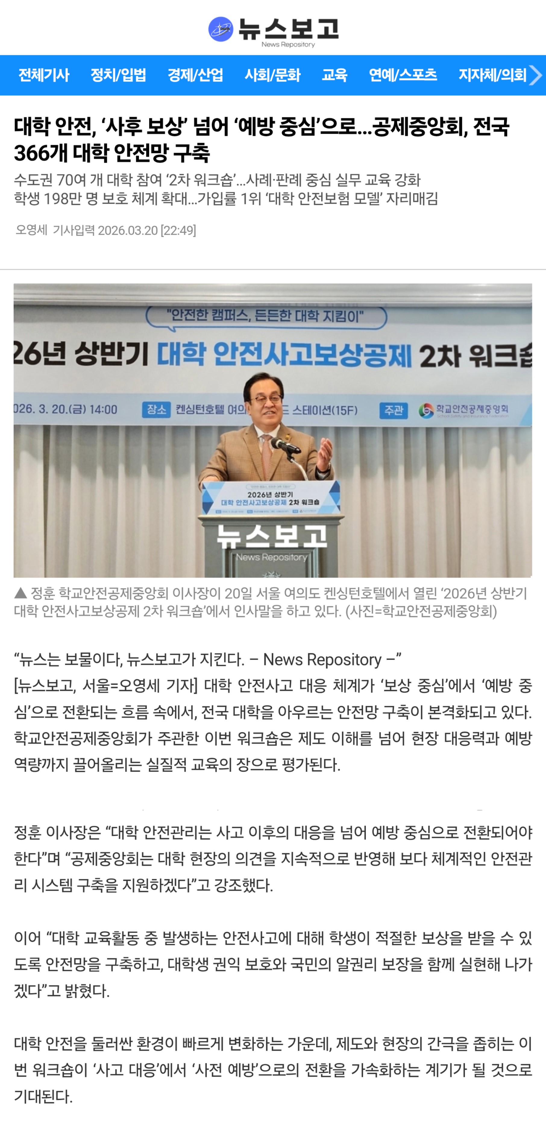 □ [뉴스보고] (2026.03.20.) 대학 안전, ‘사후 보상’ 넘어 ‘예방 중심’으로…공제중앙회, 전국 366개 대학 안전망 구축 https://m.newspf.net/8804