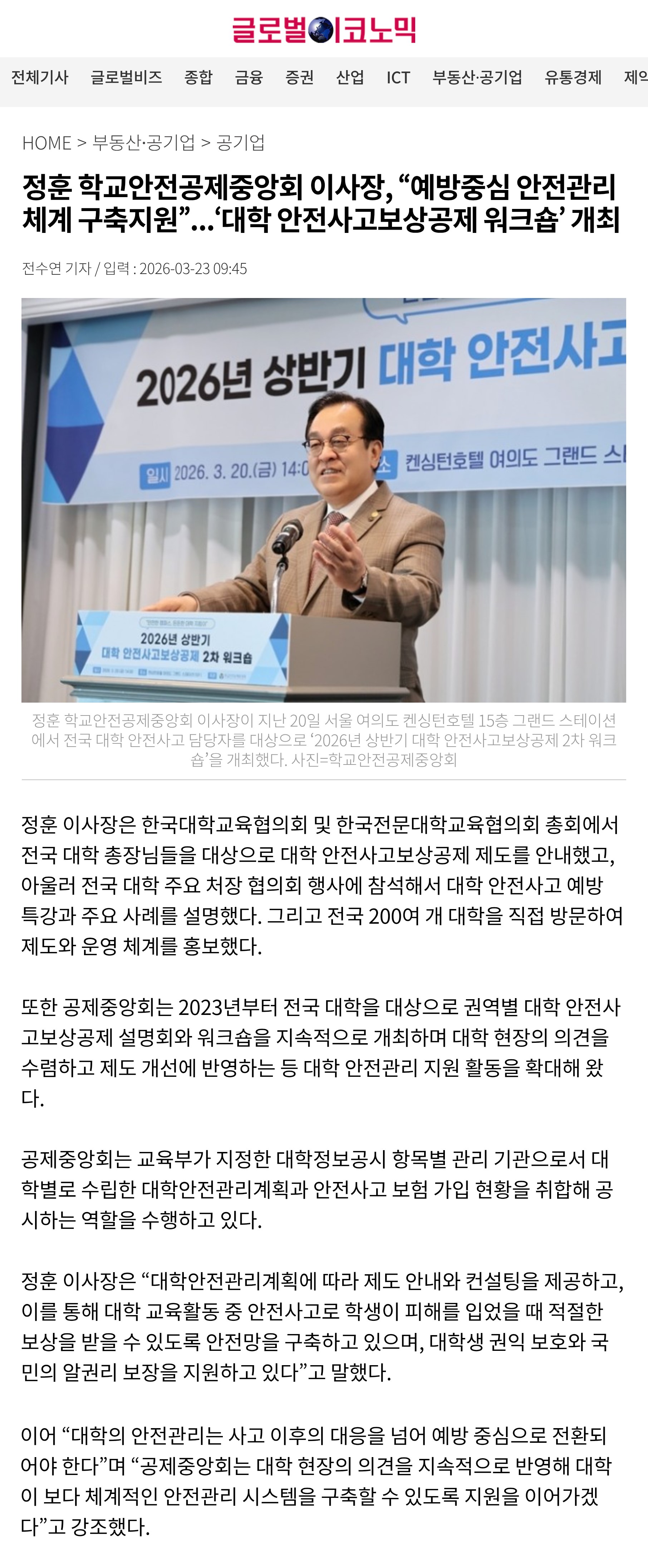 □ [글로벌이코노믹] (2026.03.23.) 정훈 학교안전공제중앙회 이사장, “예방중심 안전관리체계 구축지원”...‘대학 안전사고보상공제 워크숍’ 개최 https://m.g-enews.com/view.php?ud=20260323094427559a9fc143920_1