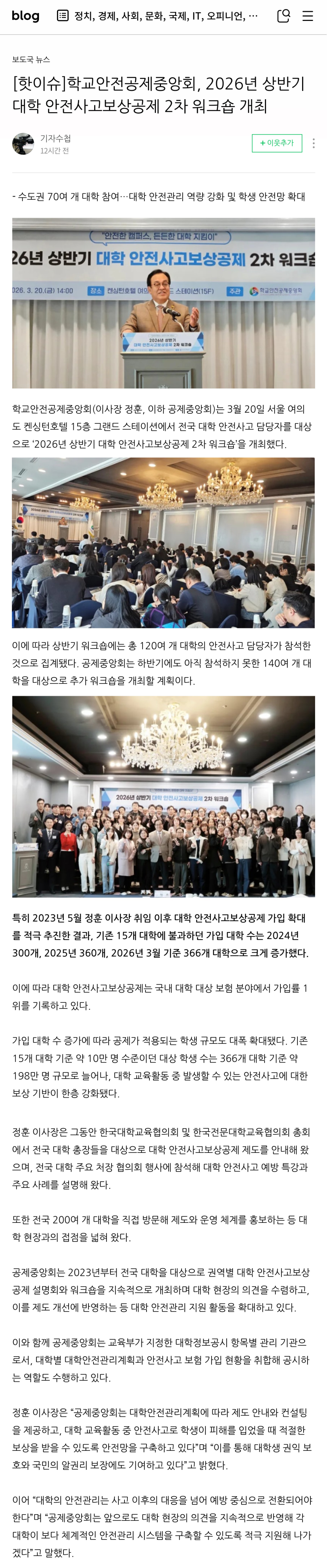 □ [기자수첩] (2026.03.25.) [핫이슈]학교안전공제중앙회, 2026년 상반기 대학 안전사고보상공제 2차 워크숍 개최 https://m.blog.naver.com/enhanok70/224228454171
