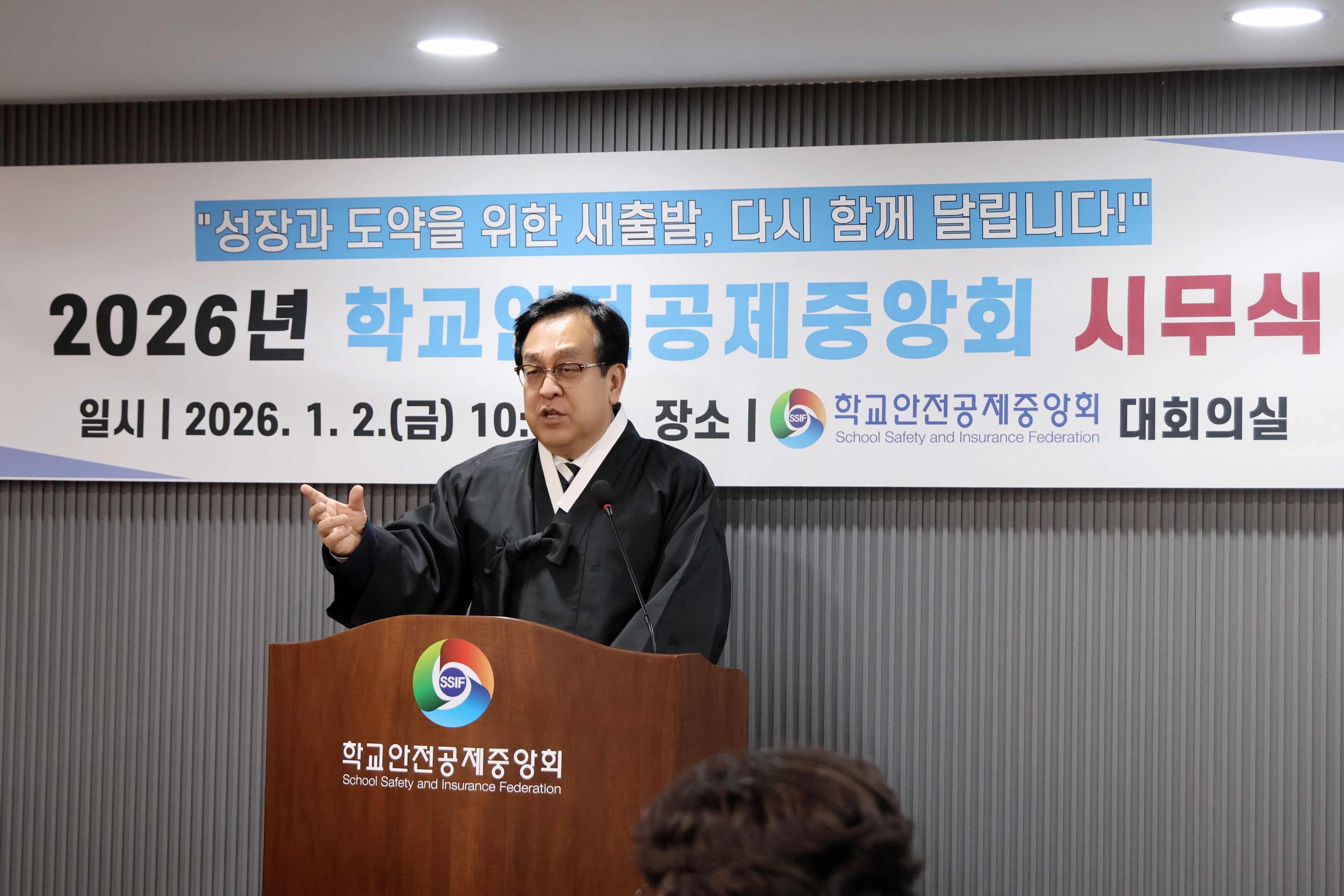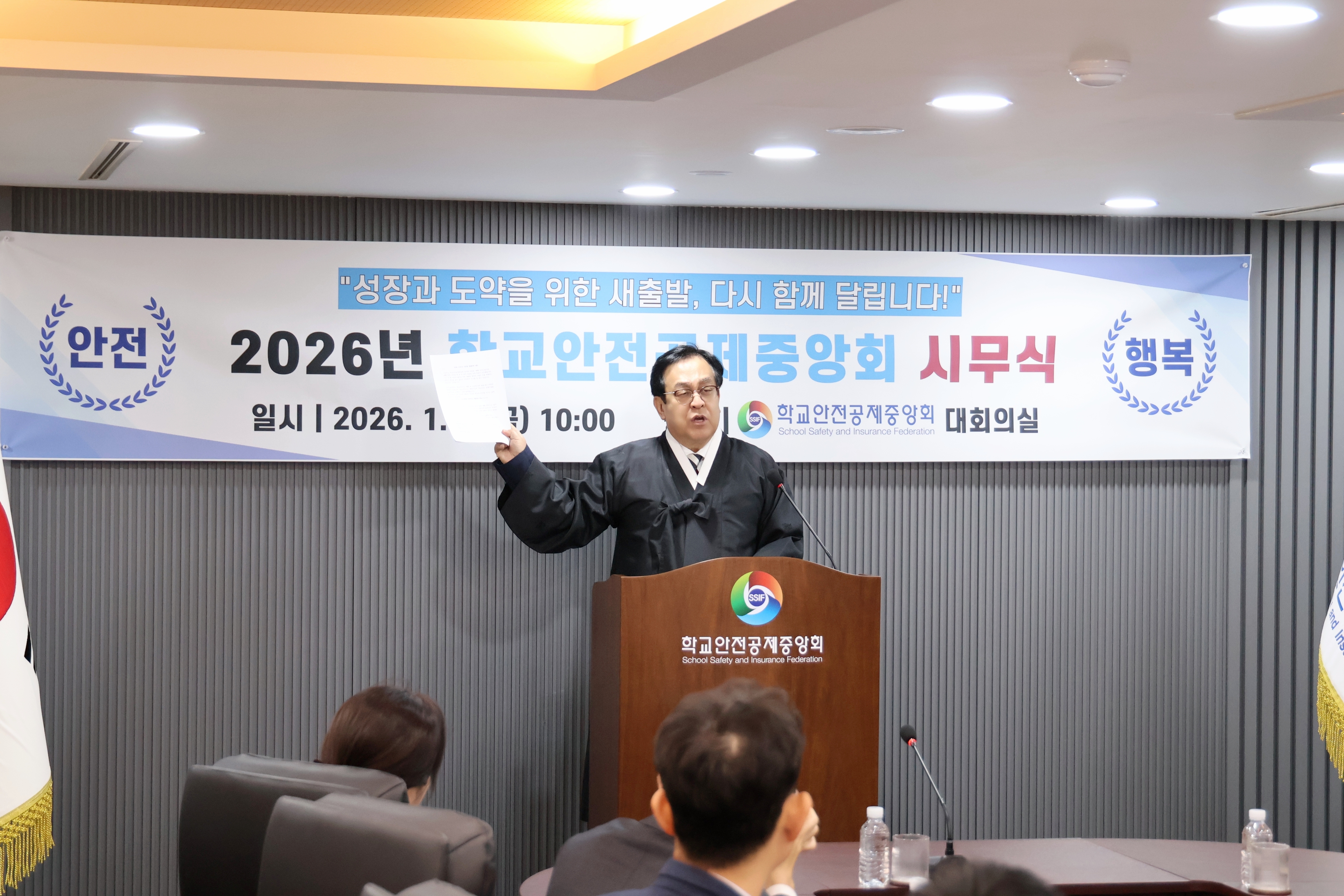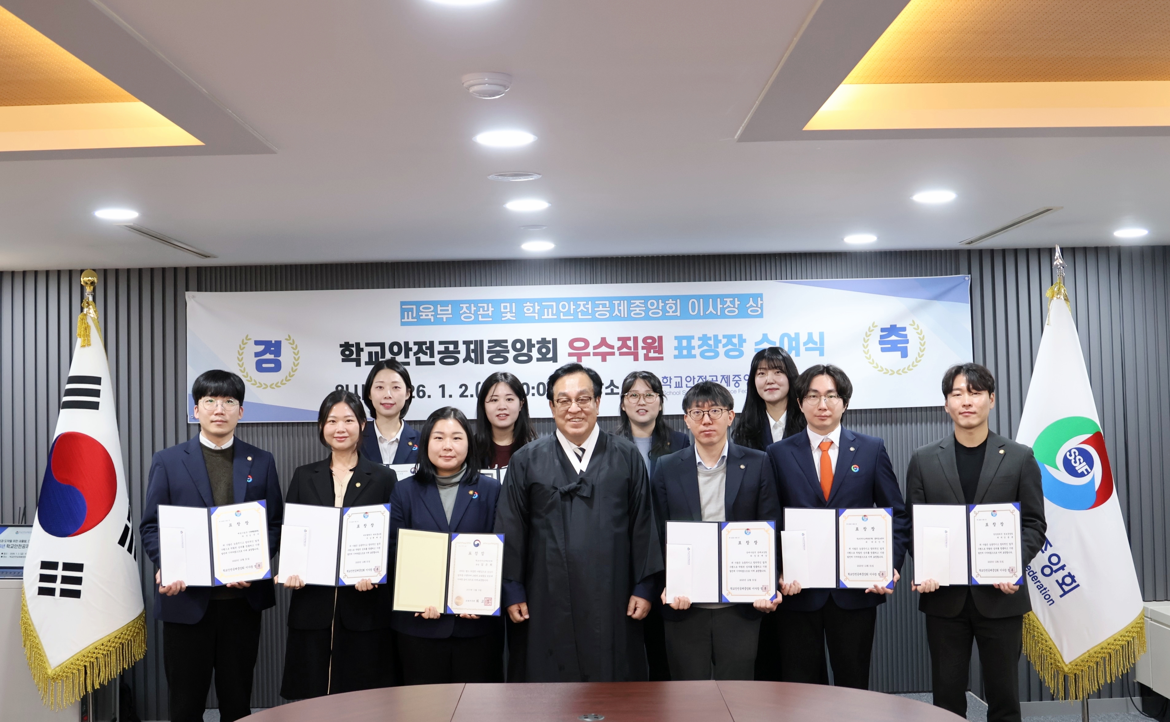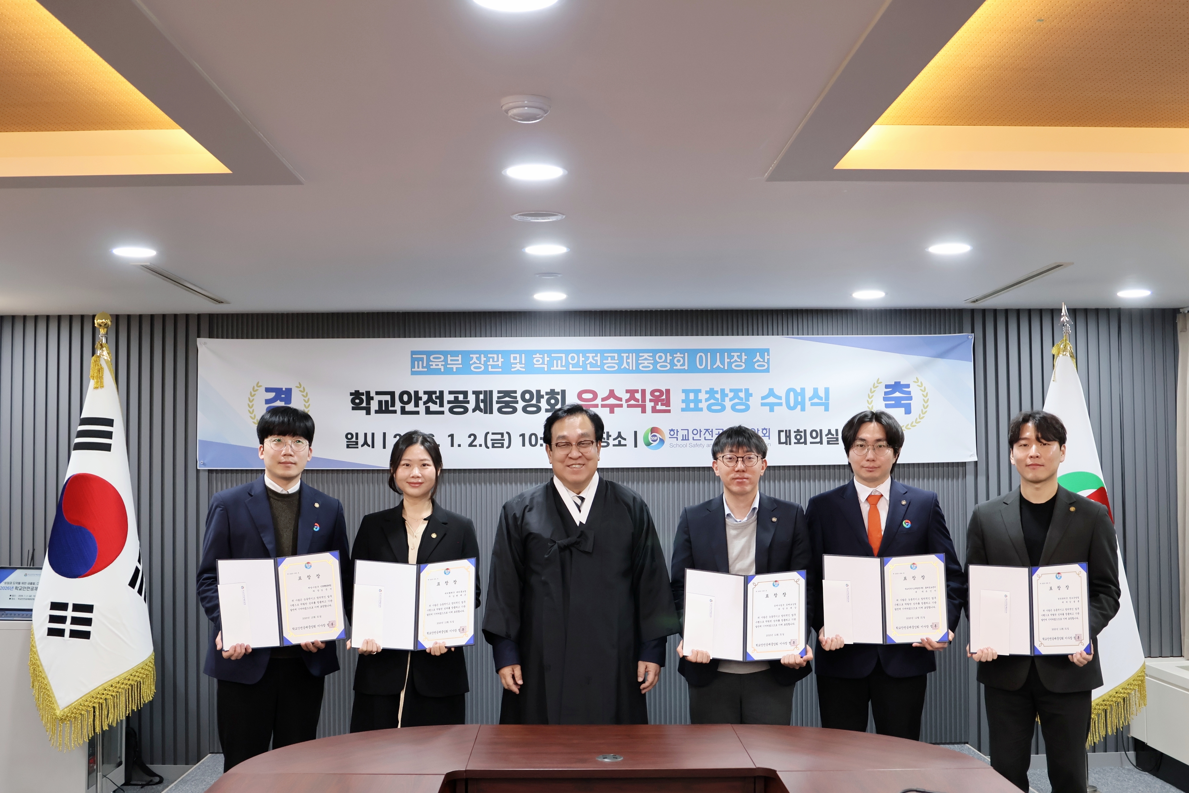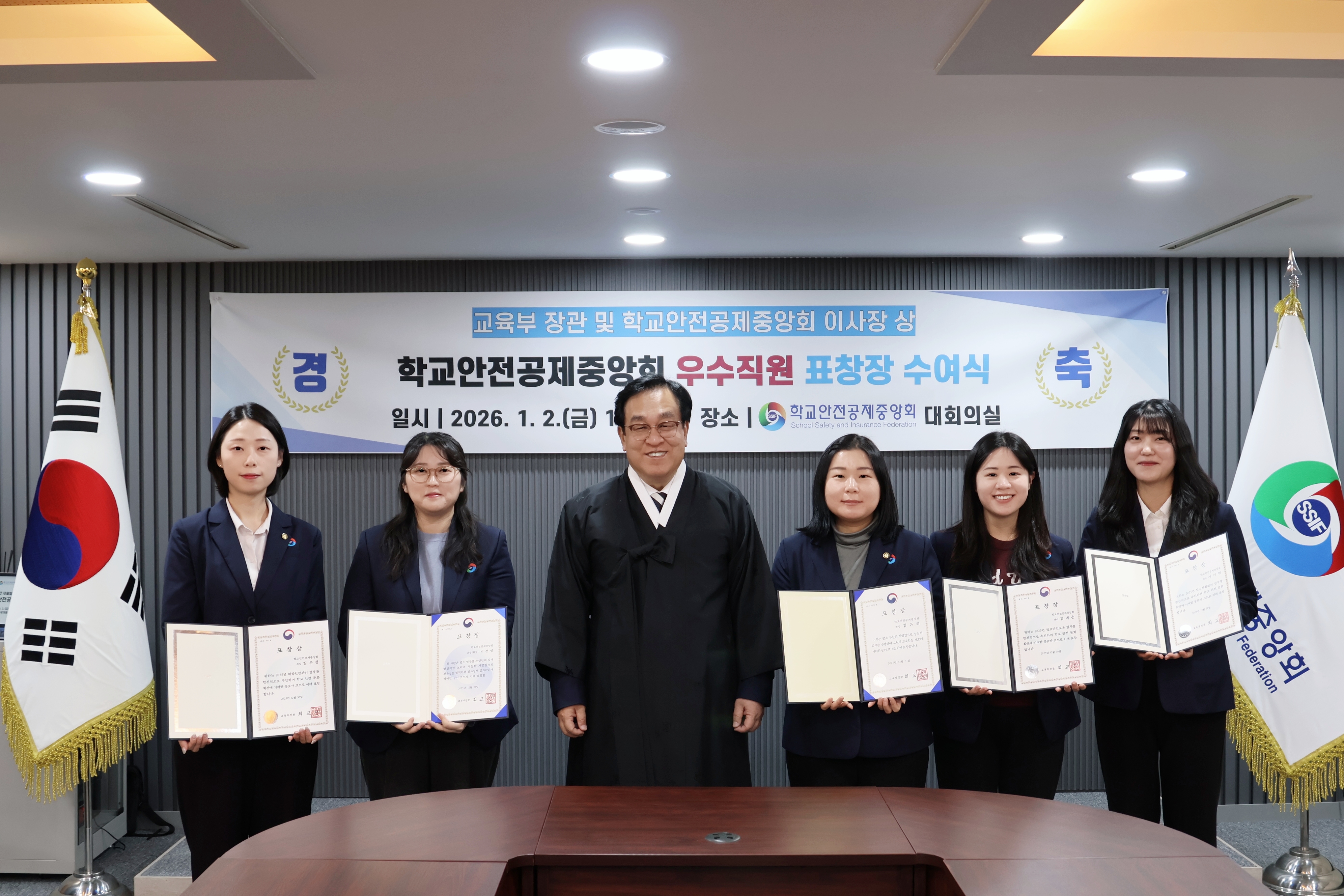 2026.1.2.(금) 학교안전공제중앙회 시무식과 우수직원 표창장 및 지역사회공헌 인정기관 패 수여식 사진입니다.(학교안전공제중앙회 8층 대회의실)