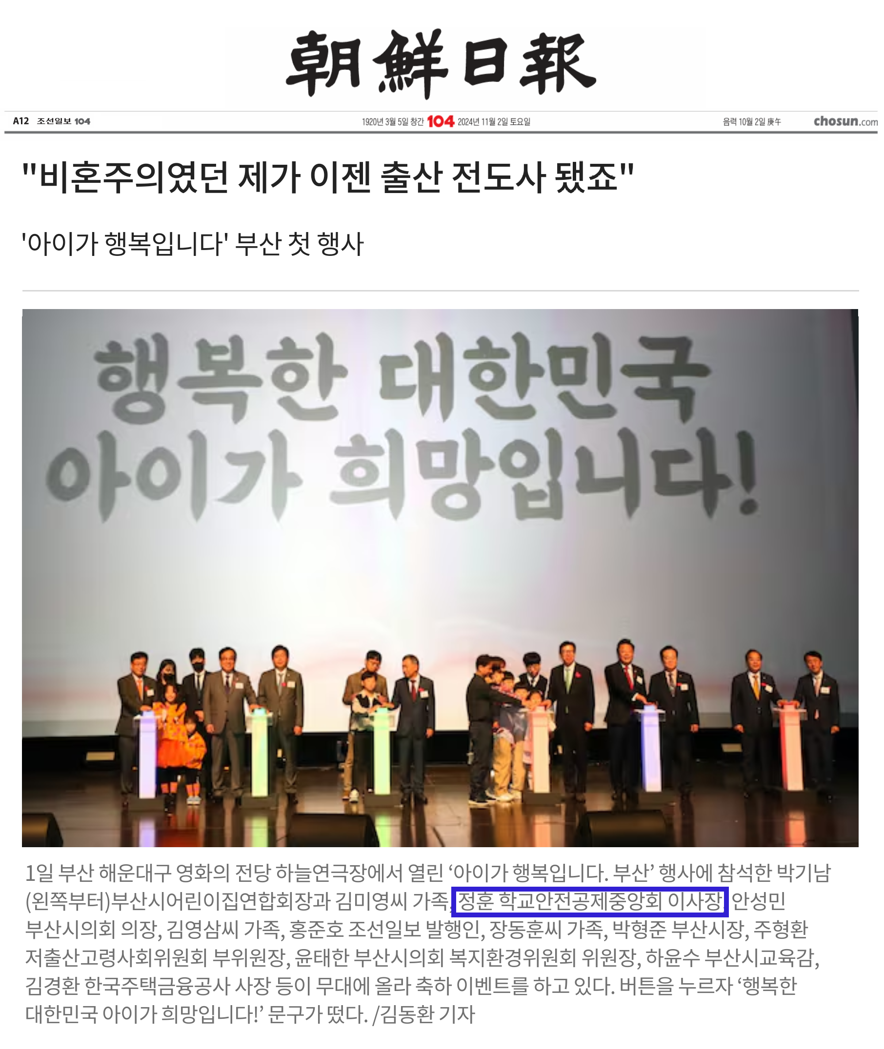 9. 2024.11.1.~2. 조선일보 주관, 학교안전공제중앙회 후원 '아이가 행복입니다 부산' 참석 행사 관련 보도기사 및 사진입니다. (장소: 부산시 해운대구 영화의전당 하늘연극장)