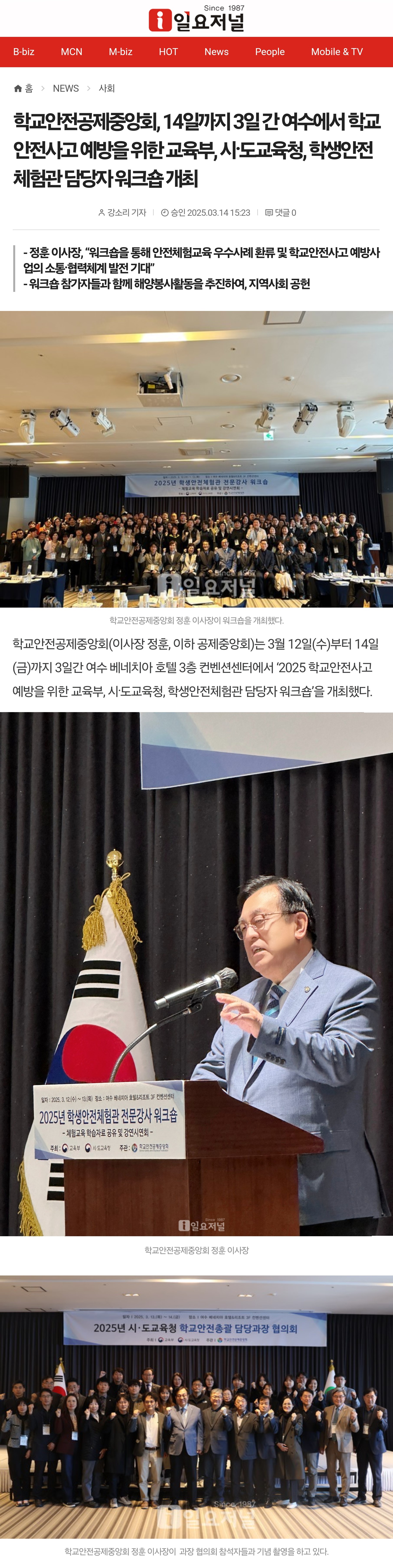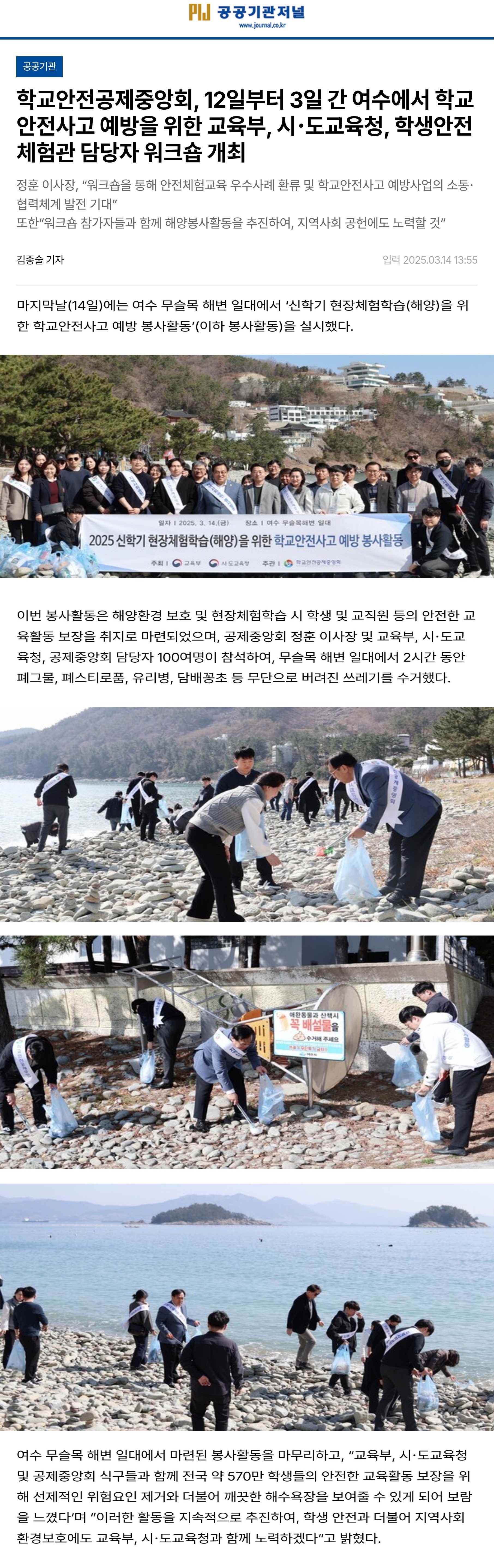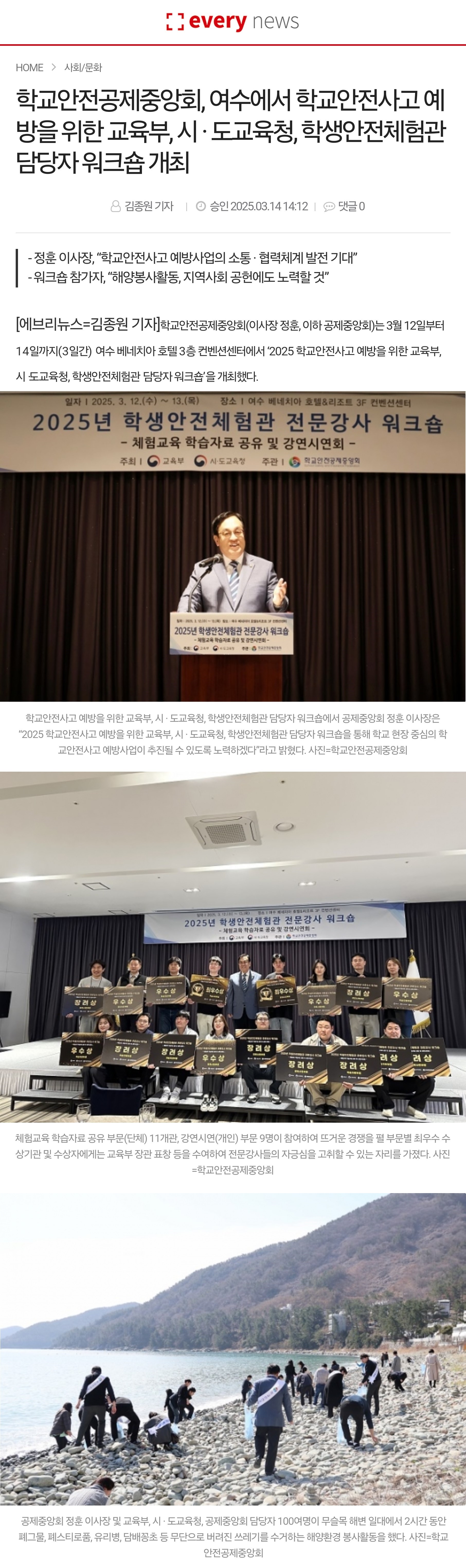 □ [에브리뉴스] (2025.3.14.) 학교안전공제중앙회, 여수에서 학교안전사고 예방을 위한 교육부, 시 · 도교육청, 학생안전체험관 담당자 워크숍 개최 https://www.everynews.co.kr/news/articleView.html?idxno=45839