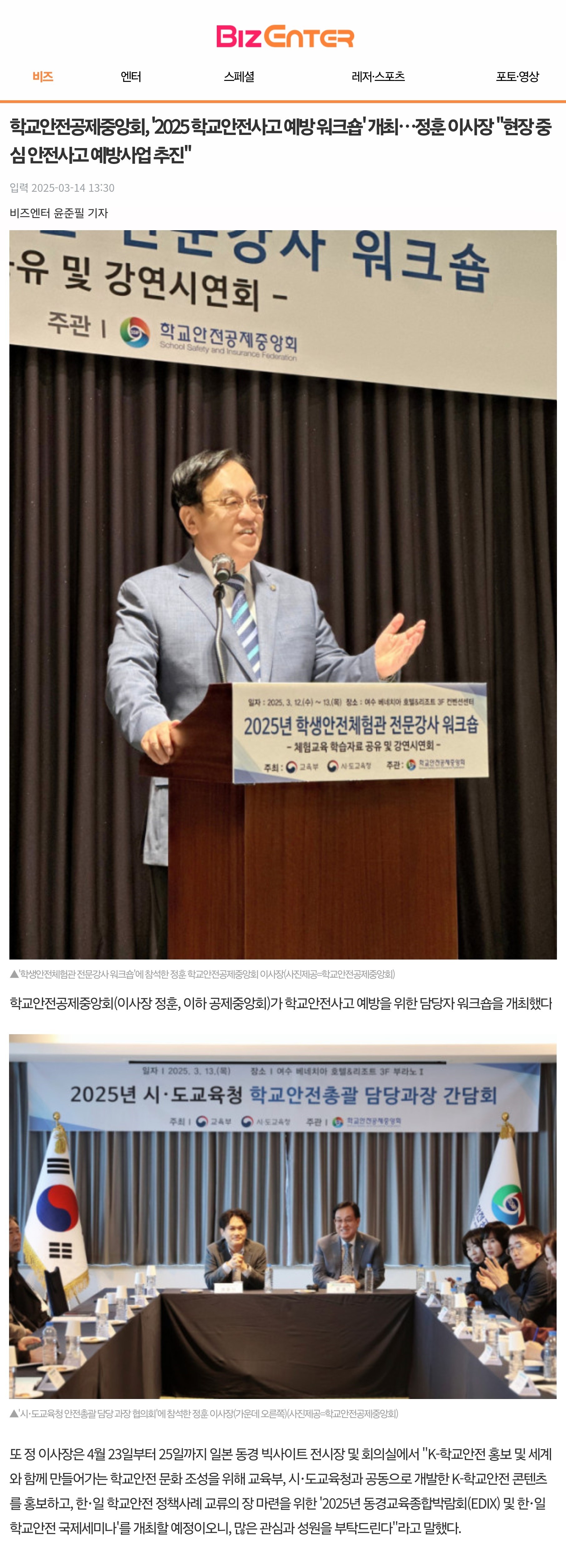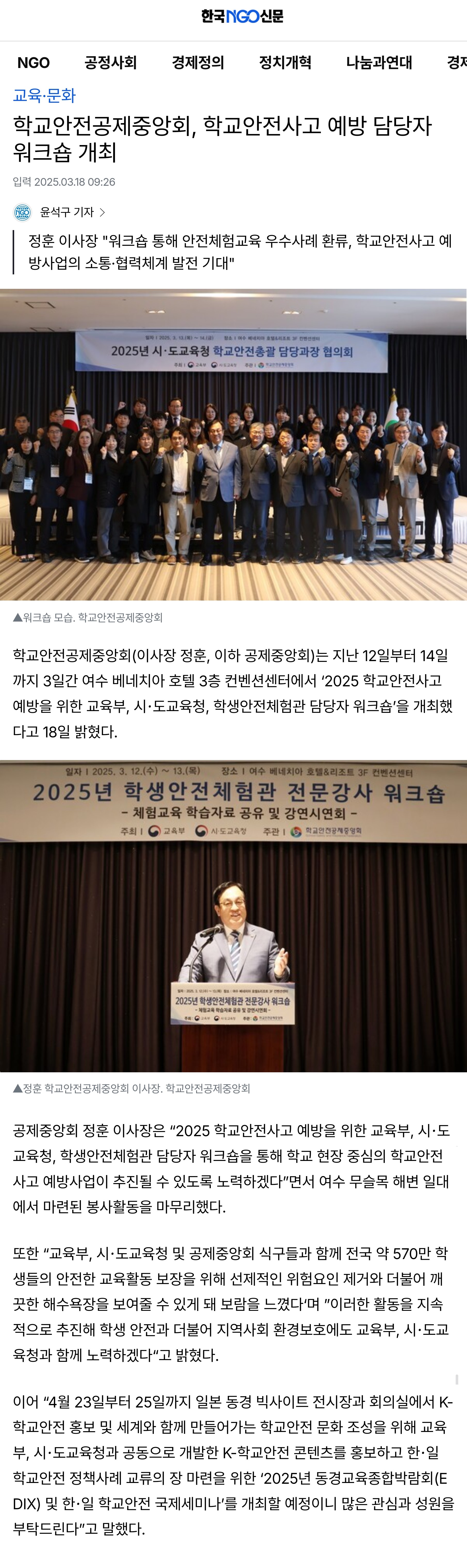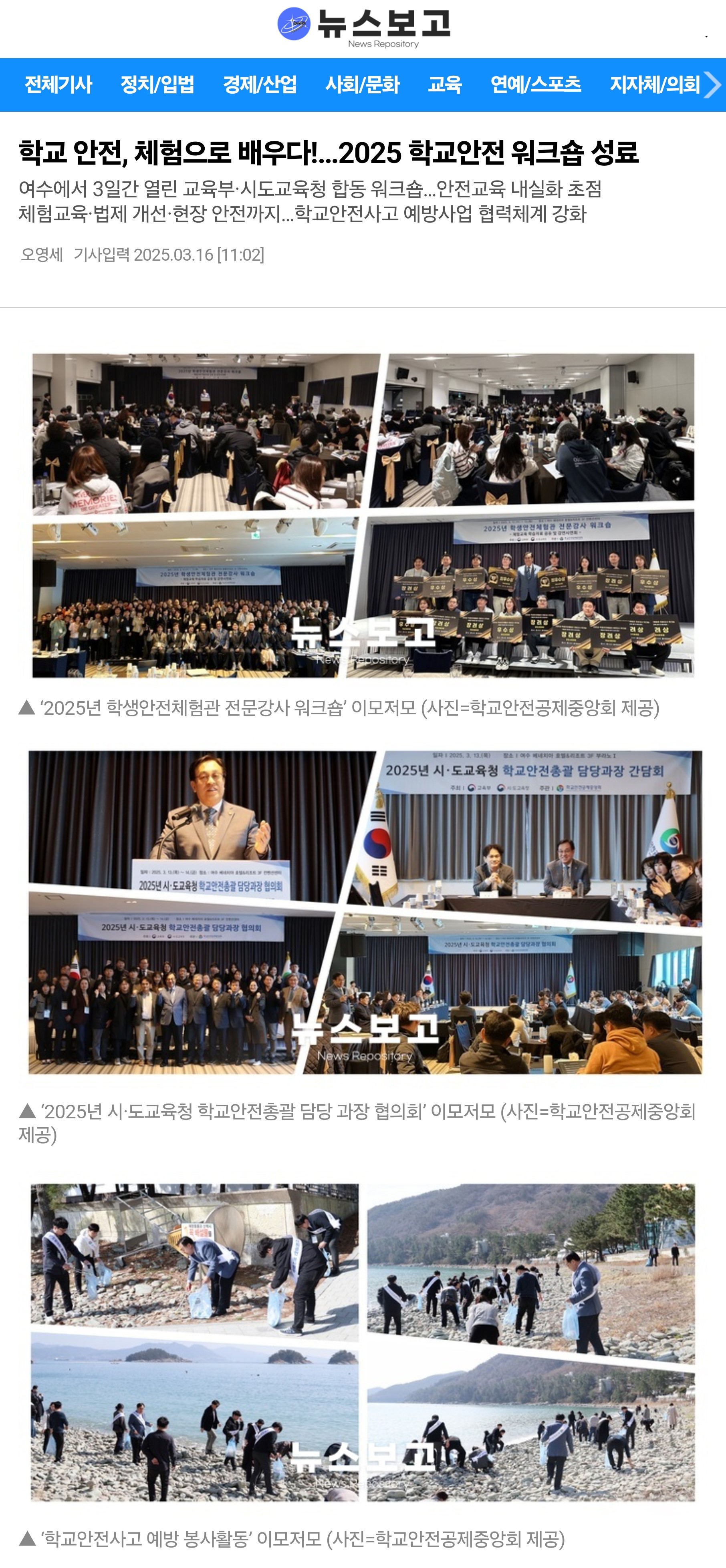 □ [한국NGO신문] (2025.3.18.) 학교안전공제중앙회, 학교안전사고 예방 담당자 워크숍 개최 https://www.ngonews.kr/news/articleView.html?idxno=204026