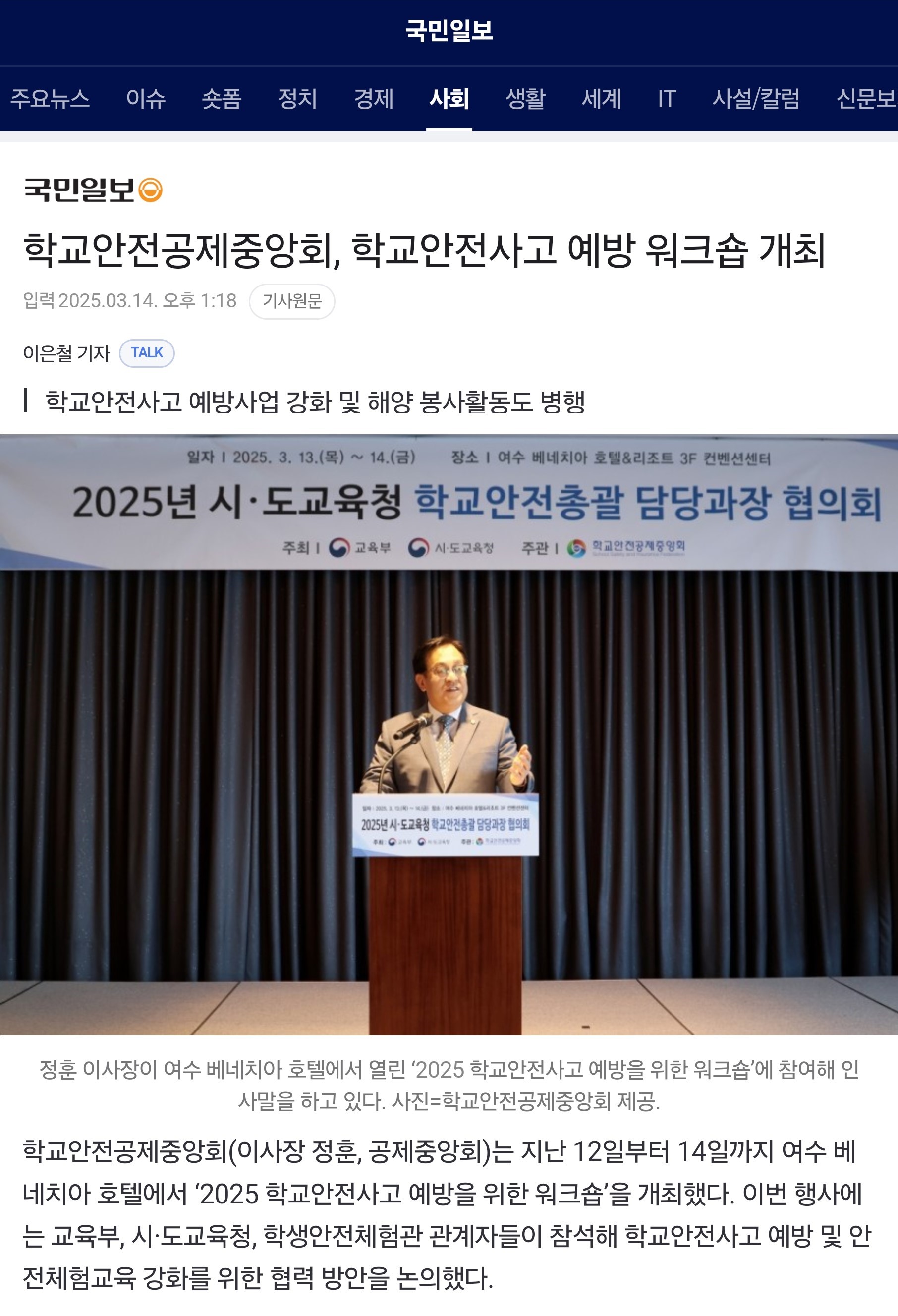 □ [국민일보] (2025.3.14.) 학교안전공제중앙회, 학교안전사고 예방 워크숍 개최 https://n.news.naver.com/article/005/0001763094?sid=102