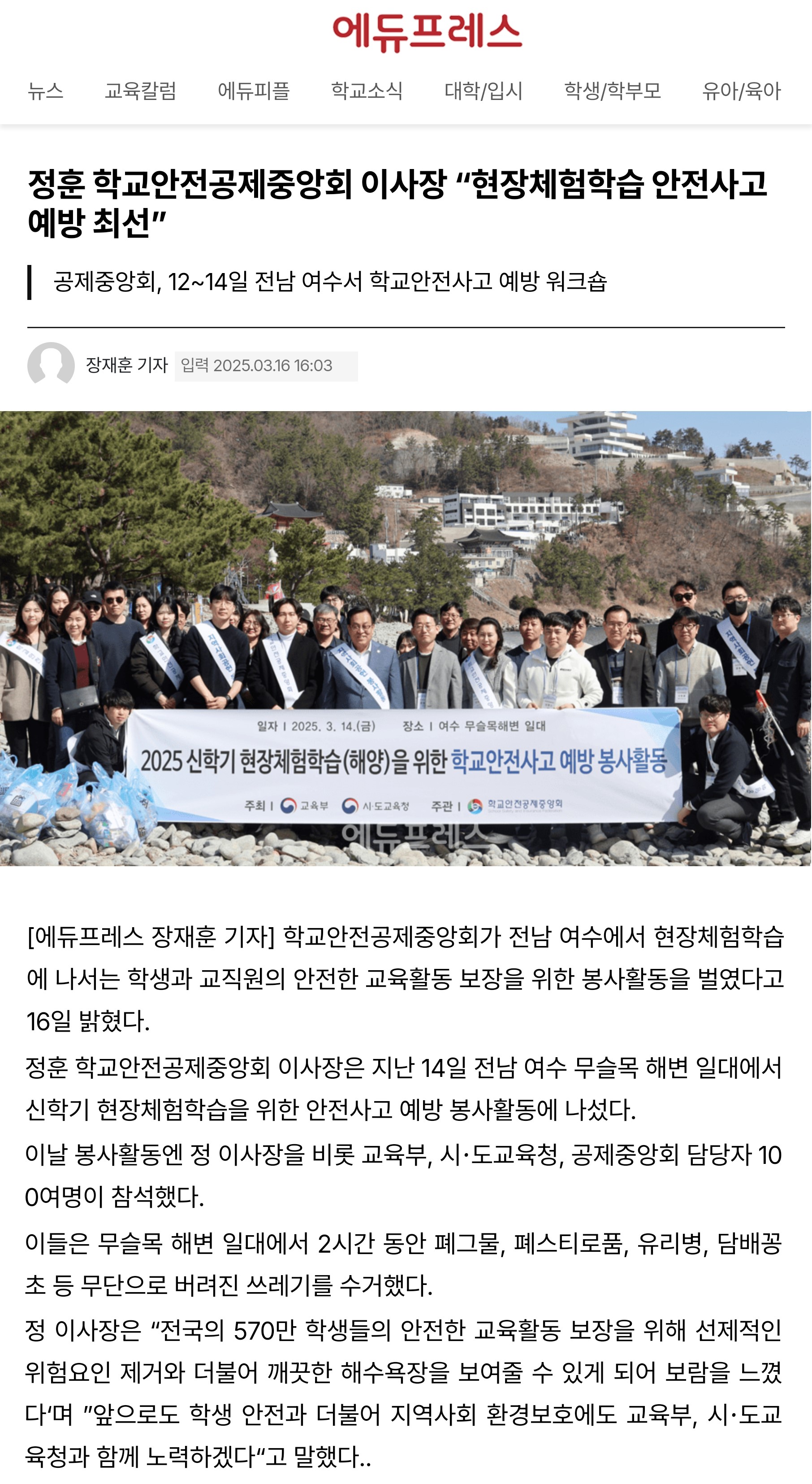 □ [에듀프레스] (2025.3.16.) 정훈 학교안전공제중앙회 이사장 “현장체험학습 안전사고 예방 최선” https://www.edupress.kr/news/articleView.html?idxno=20465