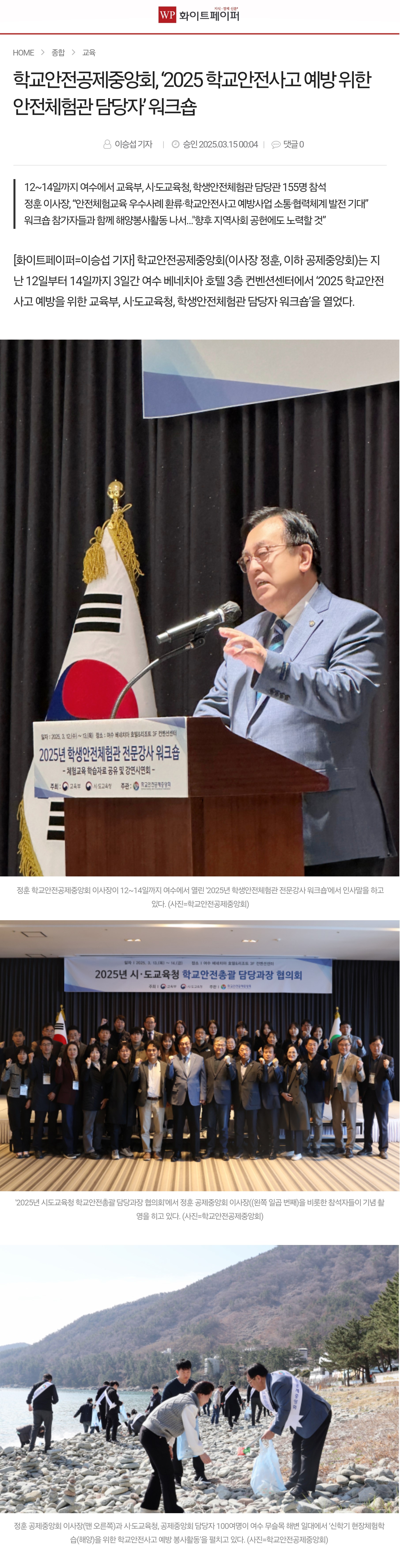 □ [화이트페이퍼] (2025.3.15.) 학교안전공제중앙회, ‘2025 학교안전사고 예방 위한 안전체험관 담당자’ 워크숍 https://www.whitepaper.co.kr/news/articleView.html?idxno=244176