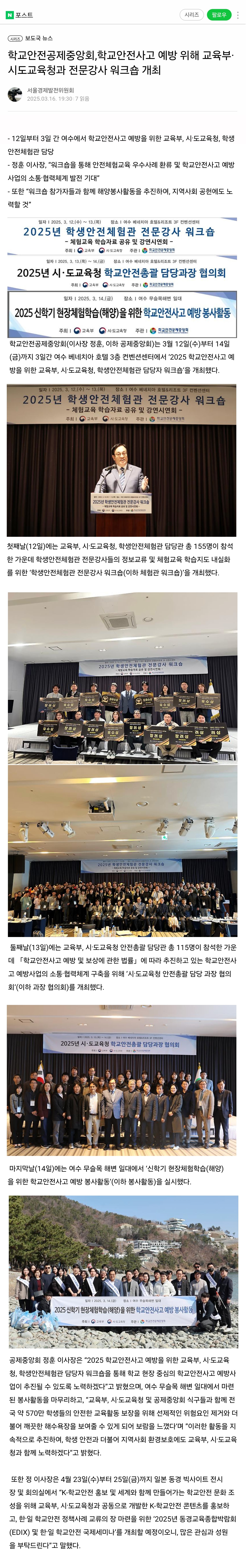 □ [서울경제발전위원회] (2025.3.16.) 학교안전공제중앙회,학교안전사고 예방 위해 교육부·시도교육청과 전문강사 워크숍 개최 https://naver.me/5GpFeg05