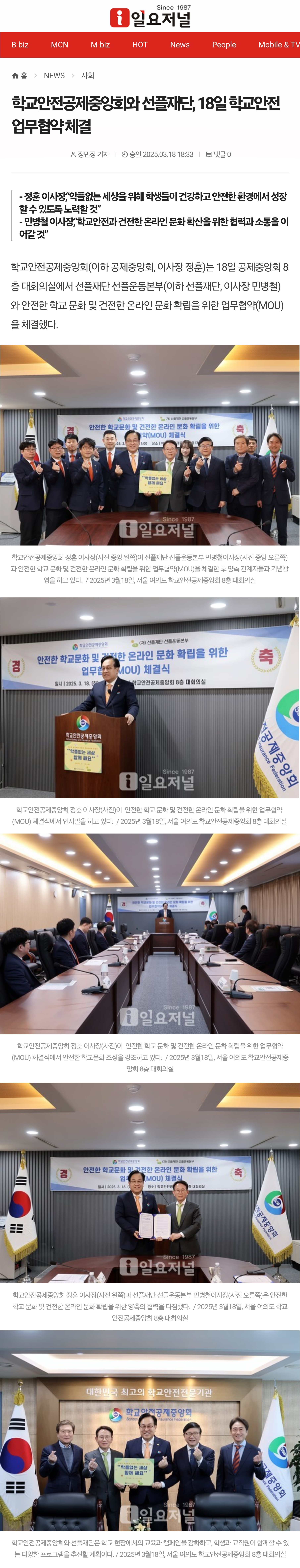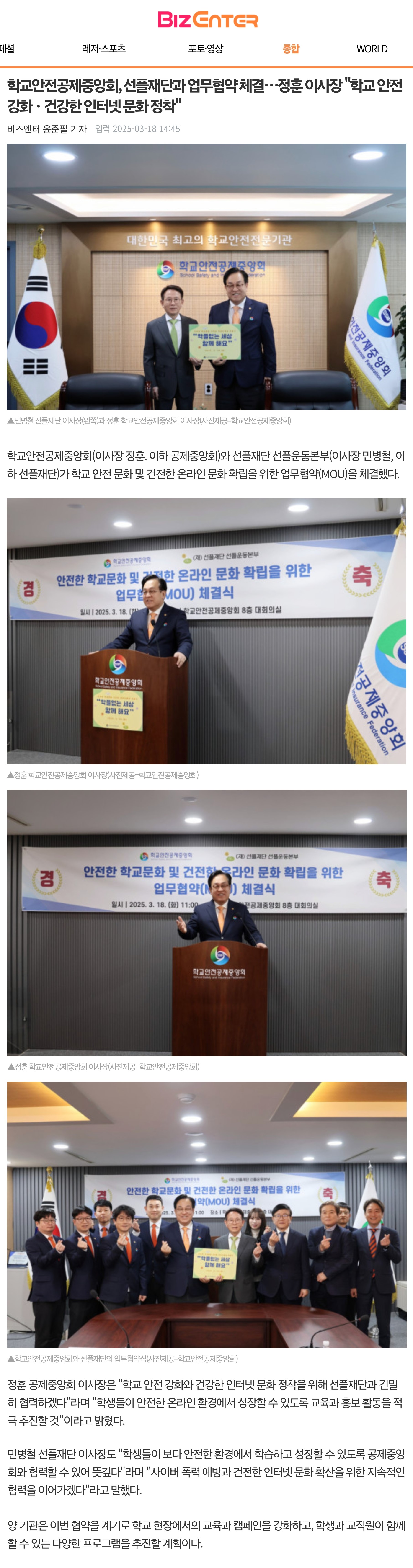 □ [비즈엔터] (2025.3.18.) 학교안전공제중앙회, 선플재단과 업무협약 체결…정훈 이사장 "학교 안전 강화ㆍ건강한 인터넷 문화 정착" https://enter.etoday.co.kr/news/view/274134