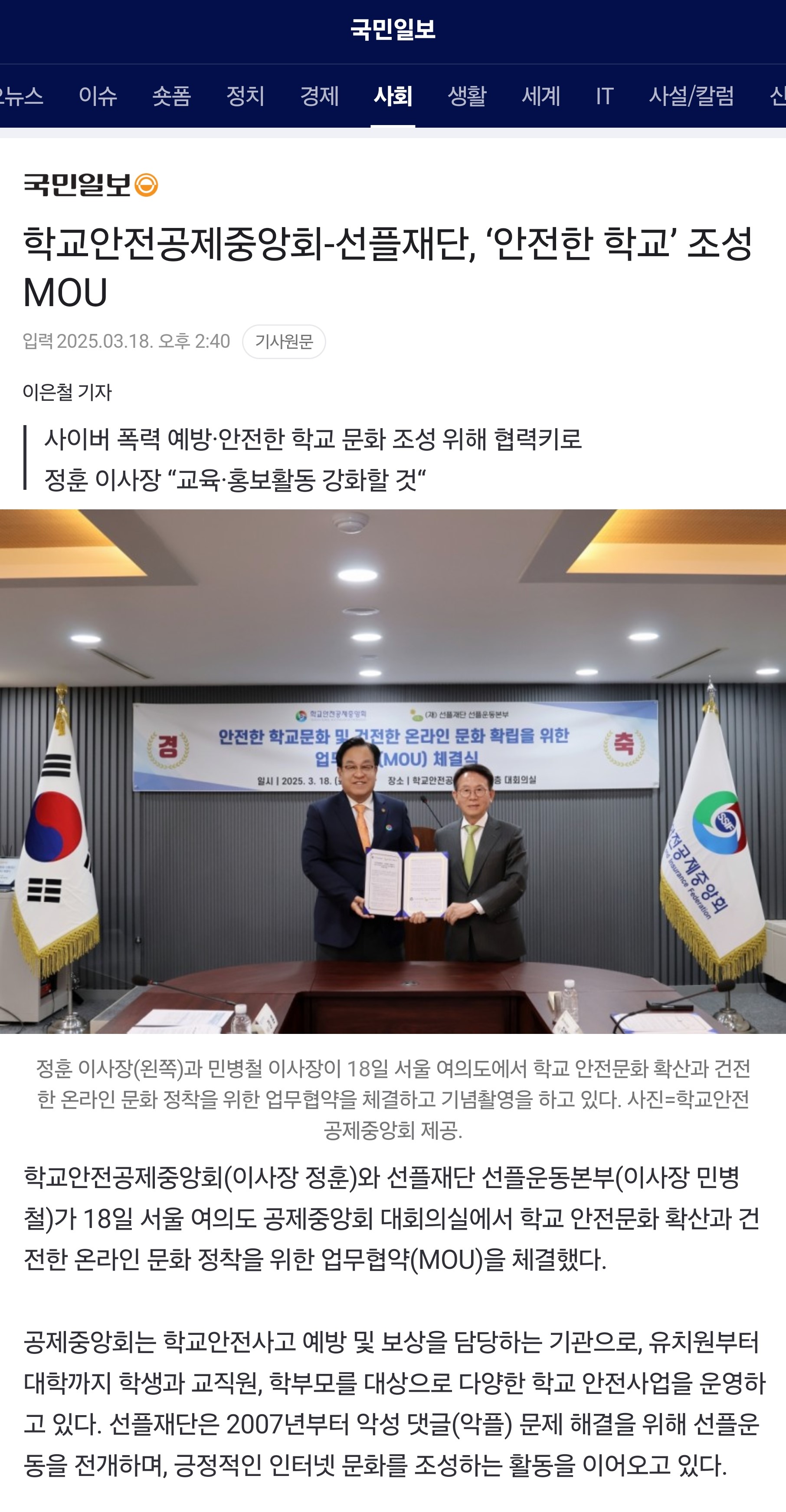 □ [국민일보] (2025.3.18.) 학교안전공제중앙회-선플재단, ‘안전한 학교’ 조성 MOU https://n.news.naver.com/article/005/0001763806