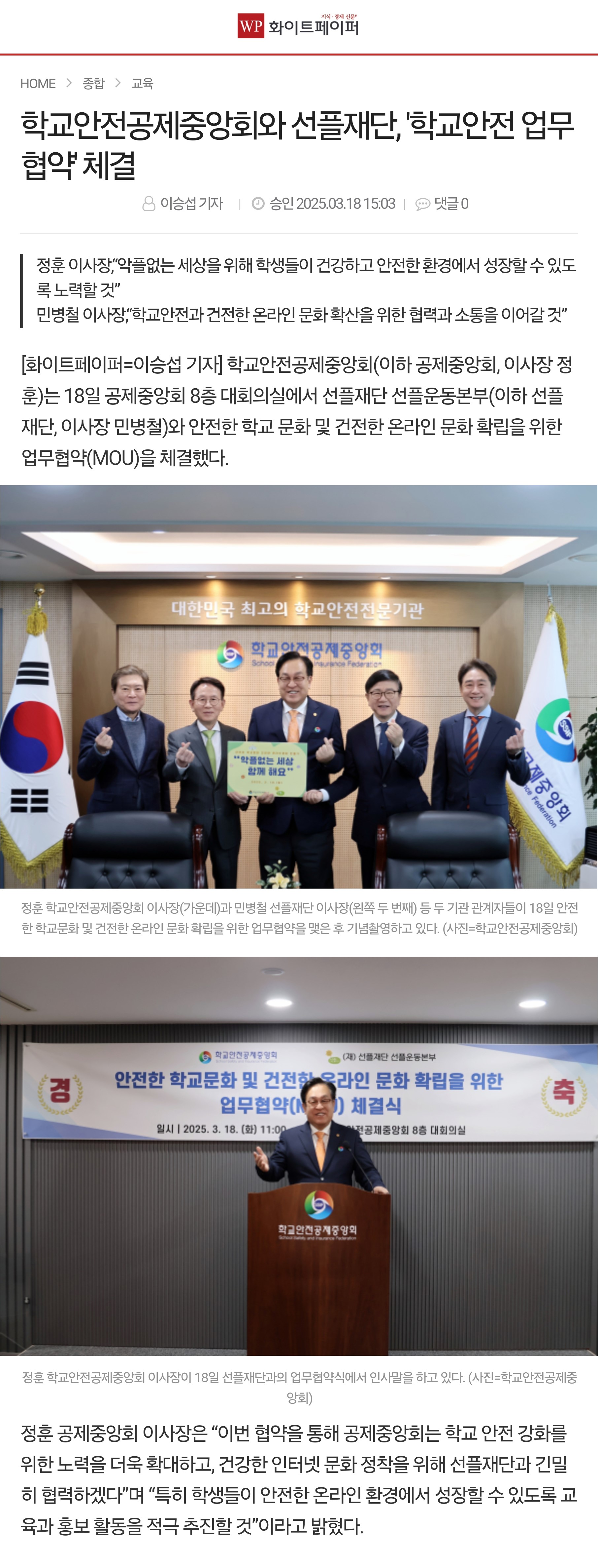 □ [화이트페이퍼] (2025.3.18.) 학교안전공제중앙회와 선플재단, '학교안전 업무협약' 체결 https://www.whitepaper.co.kr/news/articleView.html?idxno=244275
