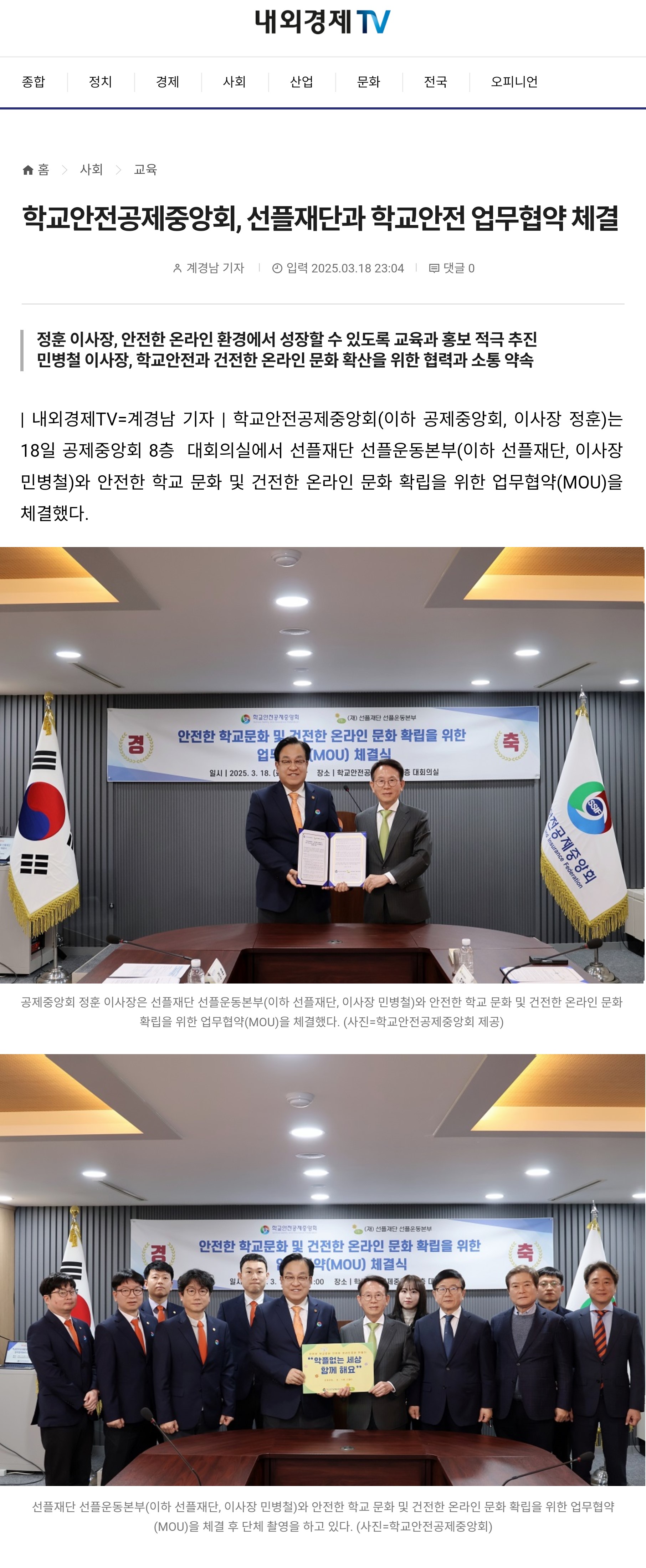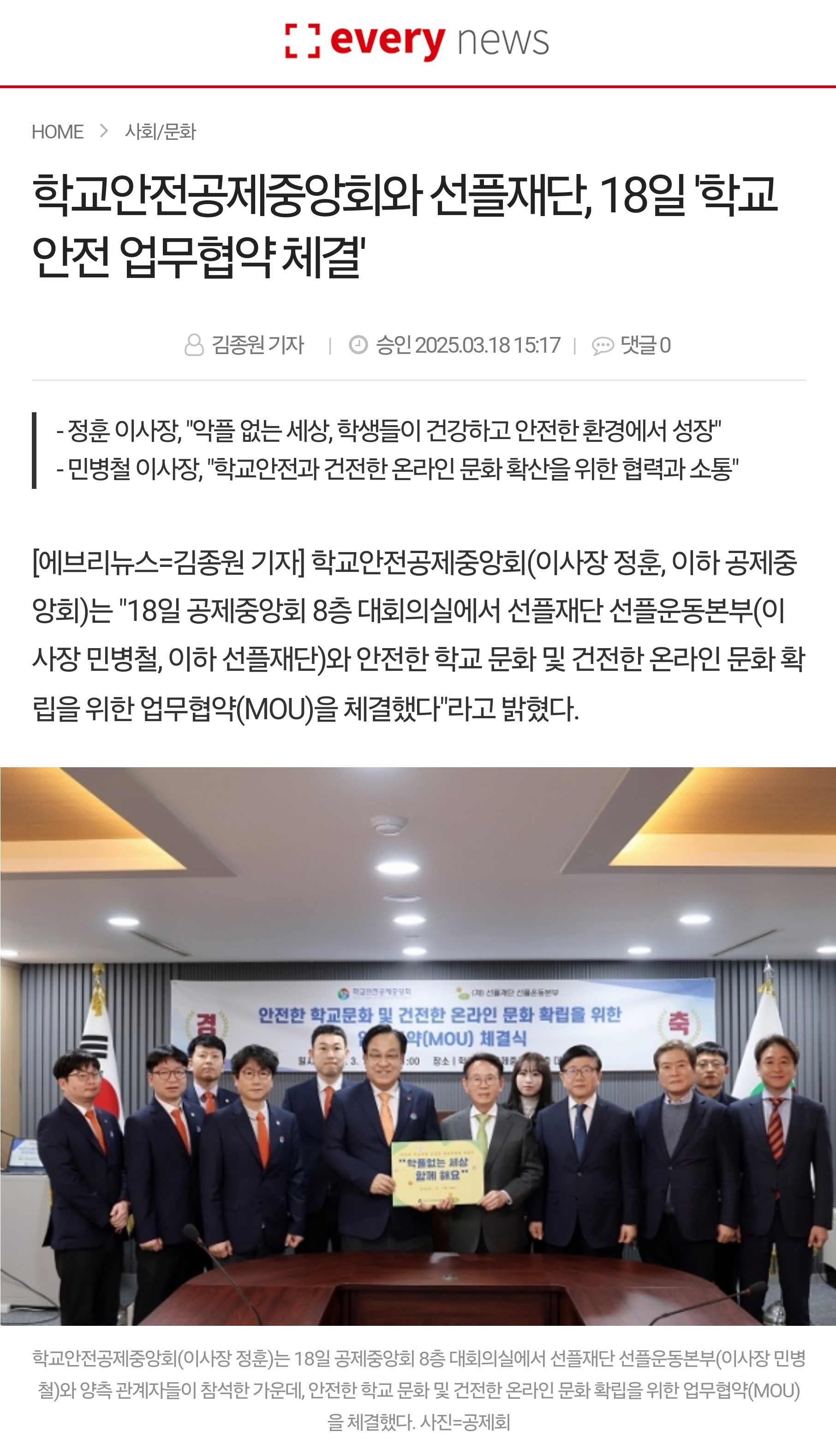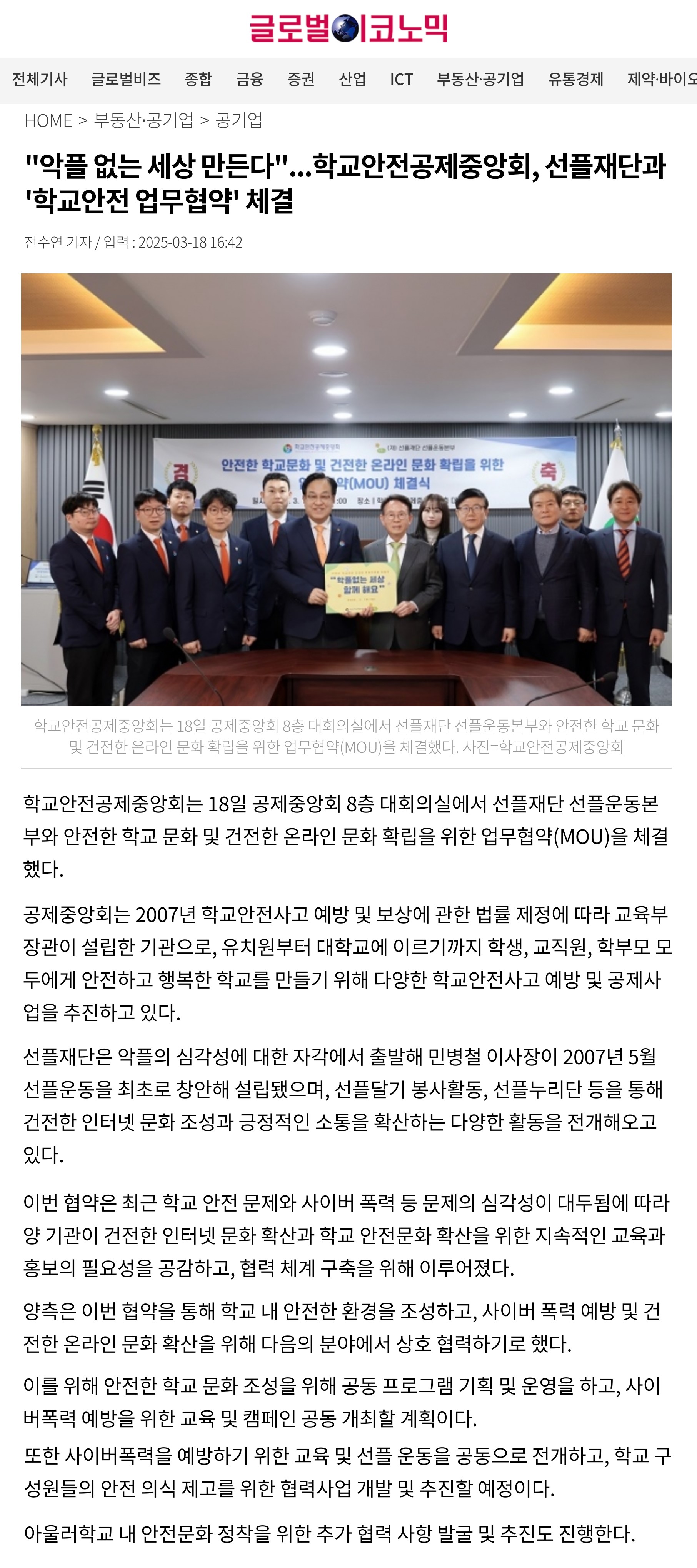 □ [글로벌이코노믹] (2025.3.18.) "악플 없는 세상 만든다"...학교안전공제중앙회, 선플재단과 '학교안전 업무협약' 체결 https://www.g-enews.com/article/Real-Estate/2025/03/202503181641387210a9fc143920_1