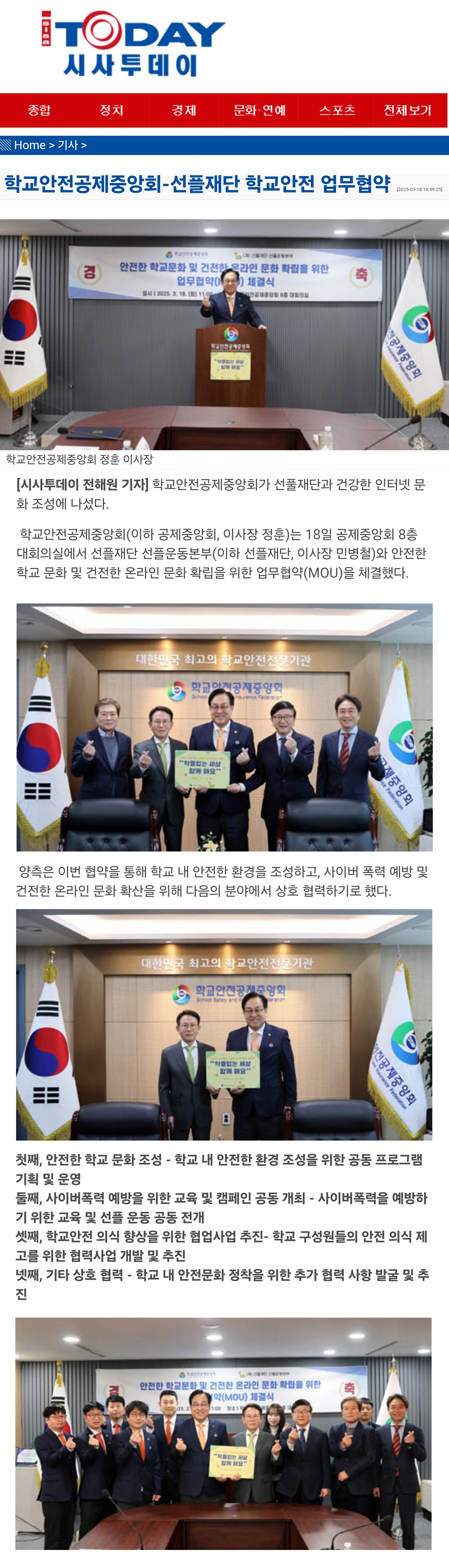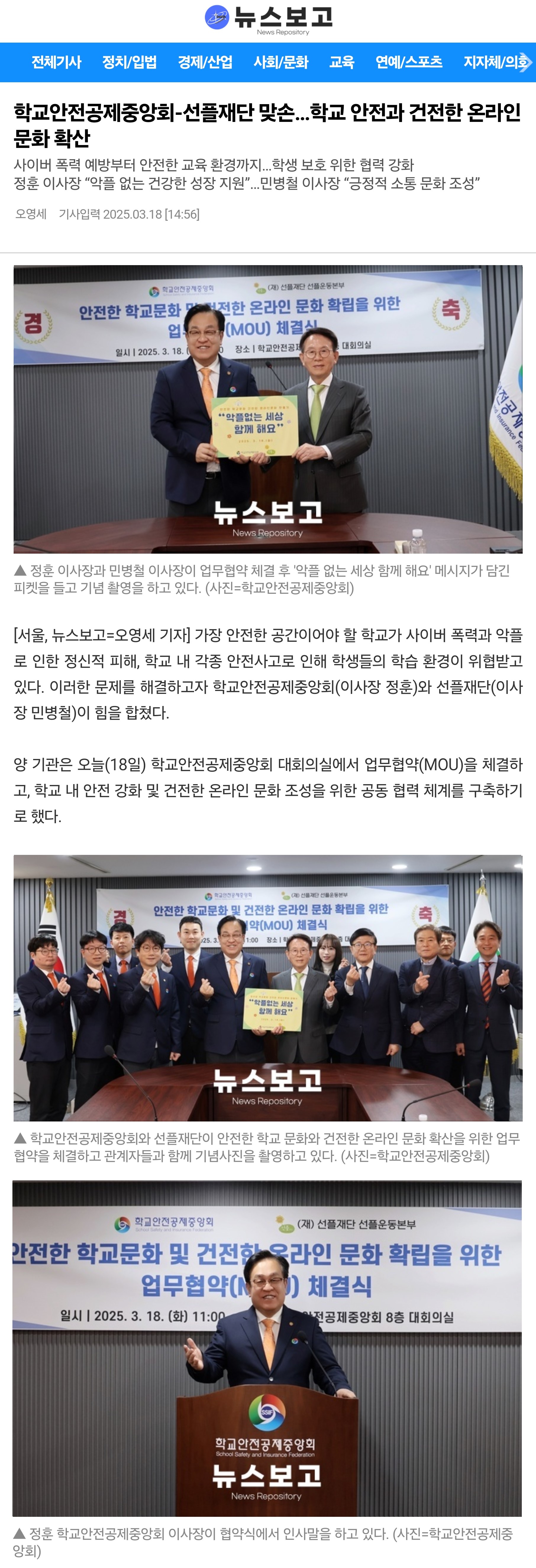□ [뉴스보고] (2025.3.18.) 학교안전공제중앙회-선플재단 맞손…학교 안전과 건전한 온라인 문화 확산 https://m.newspf.net/4879