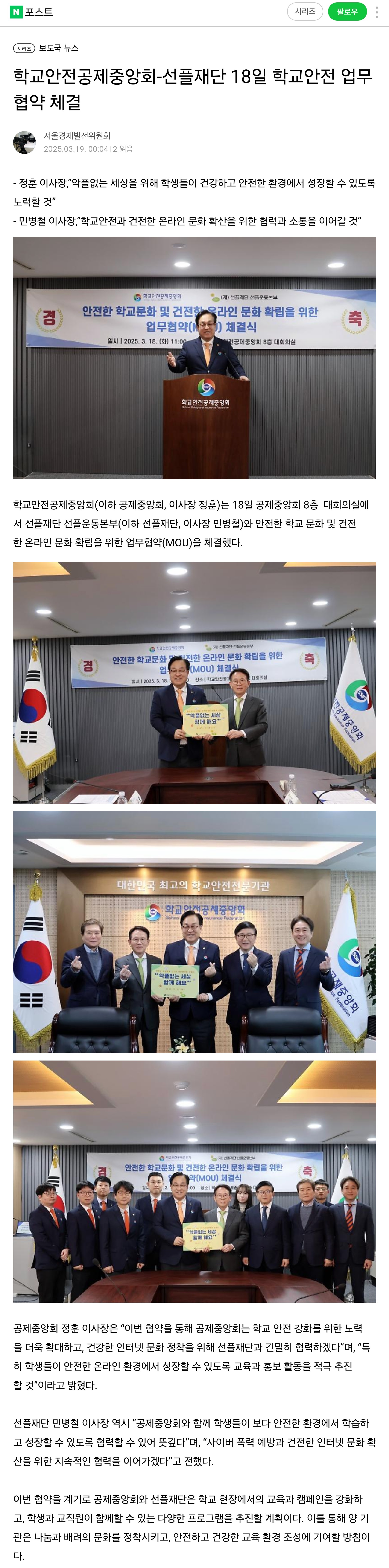 □ [서울경제발전위원회] (2025.3.19.) 학교안전공제중앙회-선플재단 18일 학교안전 업무협약 체결 https://m.post.naver.com/viewer/postView.naver?volumeNo=53748720&memberNo=7152546