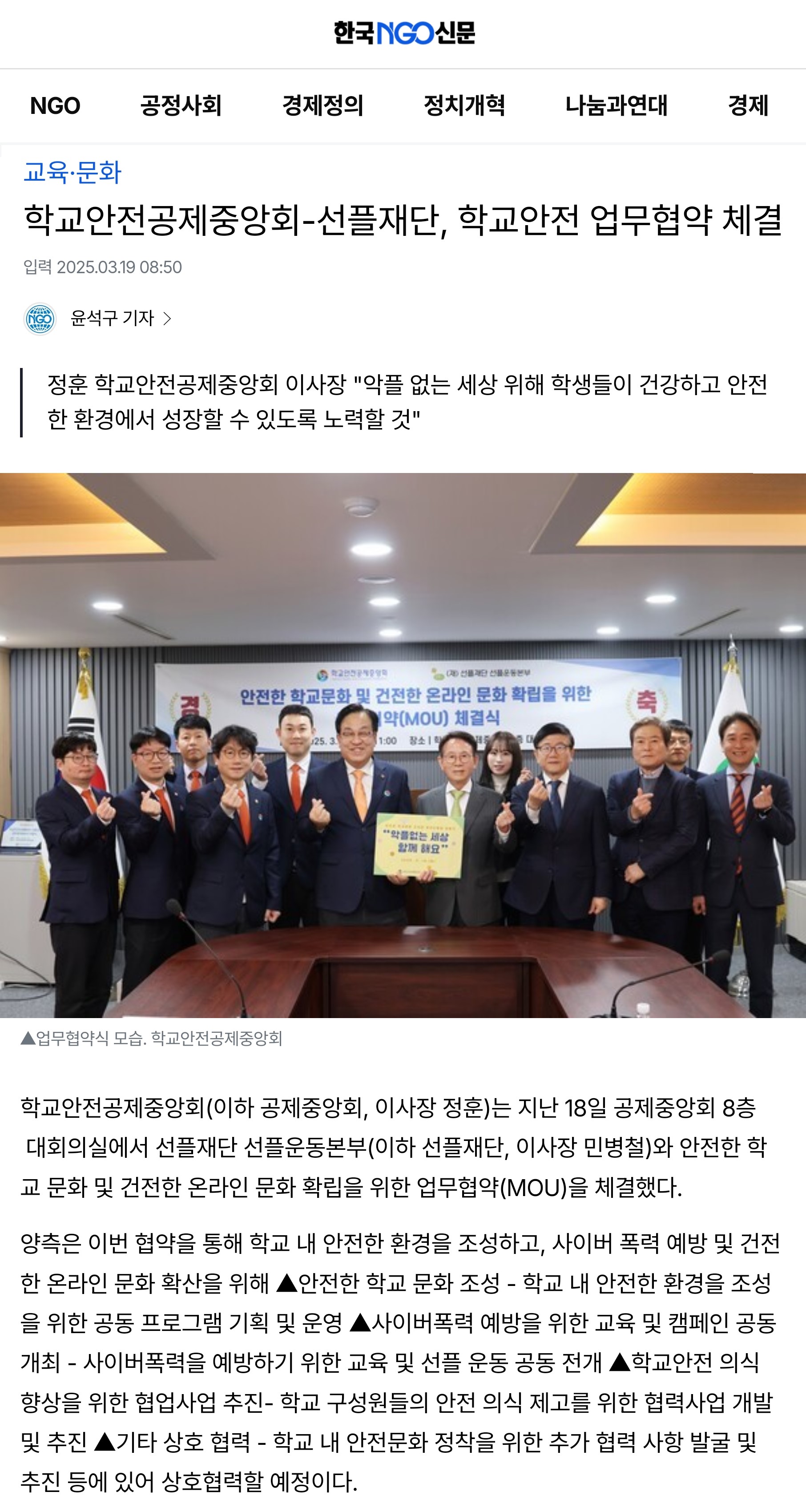□ [한국NGO신문] (2025.3.19.) 학교안전공제중앙회-선플재단, 학교안전 업무협약 체결 https://www.ngonews.kr/news/articleView.html?idxno=204072