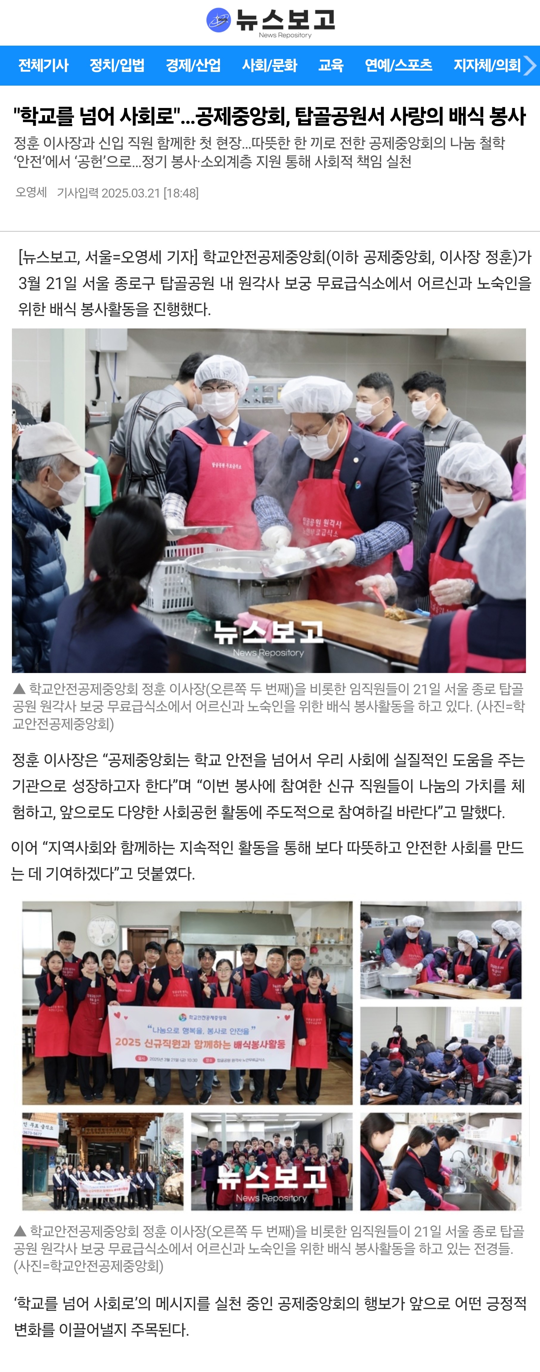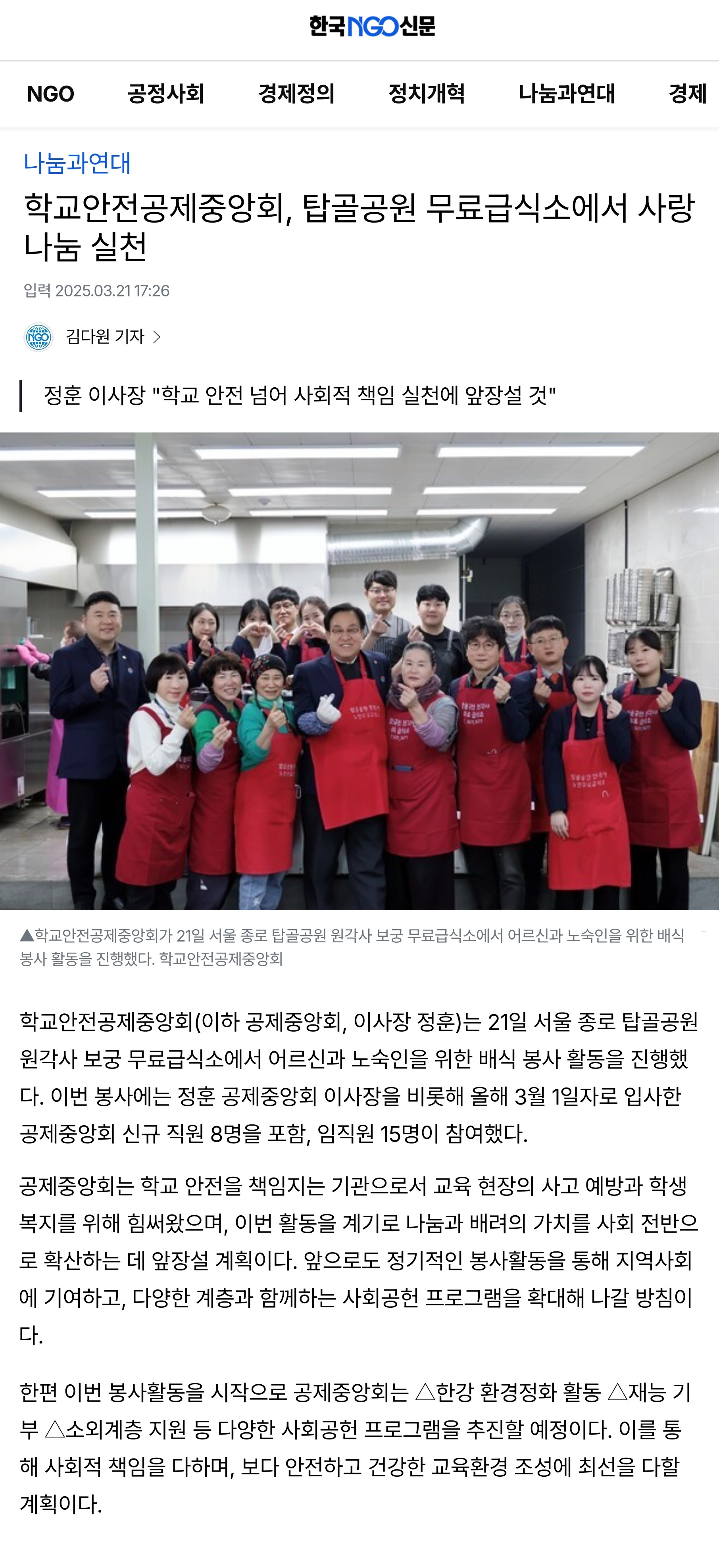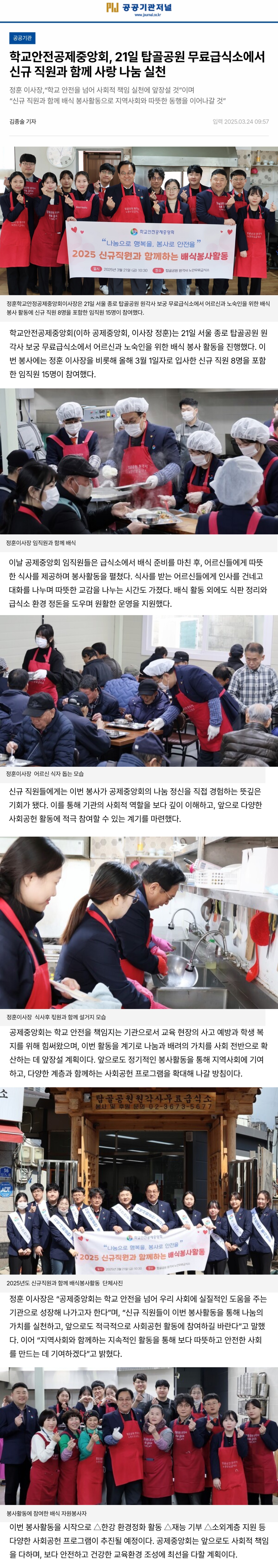 □ [한국NGO신문] (2025.3.21.) 학교안전공제중앙회, 탑골공원 무료급식소에서 사랑 나눔 실천 https://www.ngonews.kr/news/articleView.html?idxno=204189
