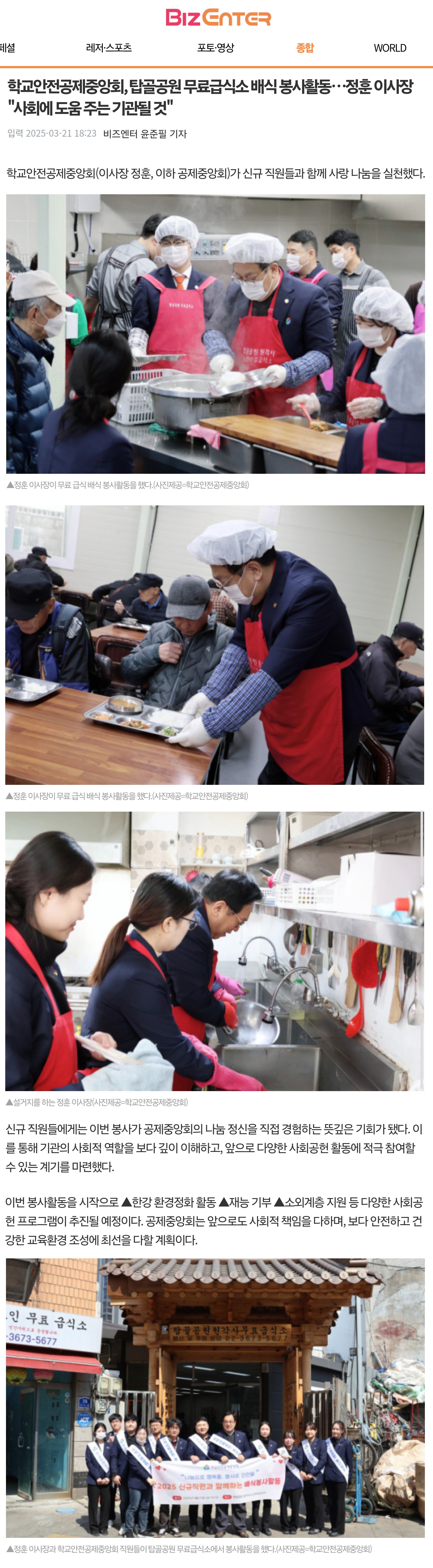 □ [비즈엔터] (2025.3.21.) 학교안전공제중앙회, 탑골공원 무료급식소 배식 봉사활동…정훈 이사장 "사회에 도움 주는 기관될 것" https://enter.etoday.co.kr/news/view/274308