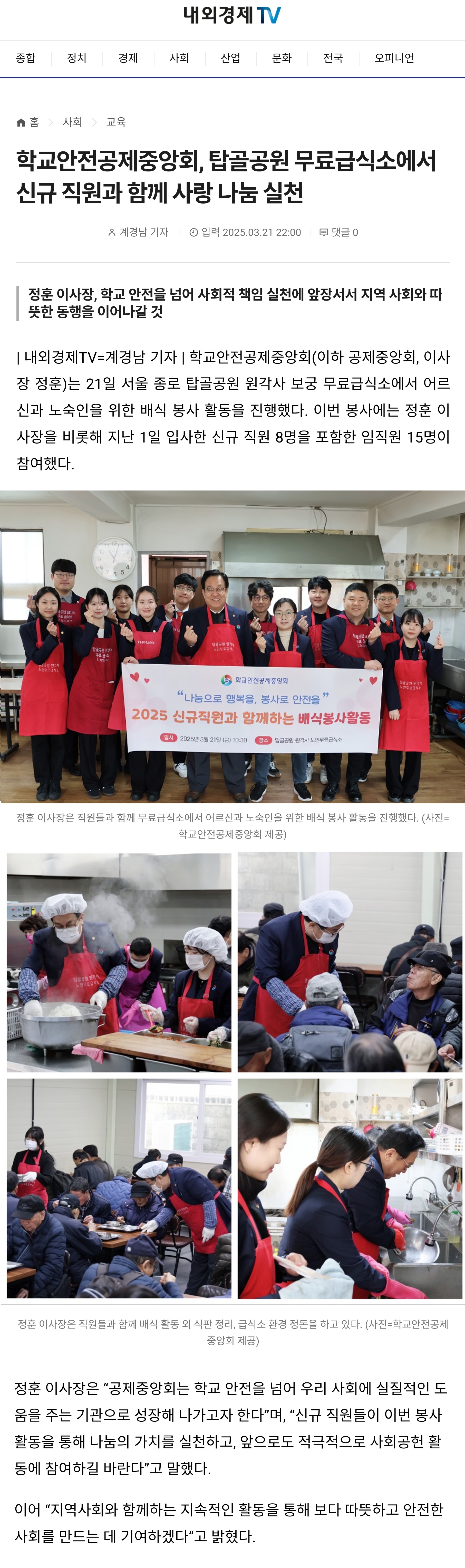 □ [내외경제TV] (2025.3.21.) 학교안전공제중앙회, 탑골공원 무료급식소에서 신규 직원과 함께 사랑 나눔 실천 https://www.nbntv.co.kr/news/articleView.html?idxno=3036003