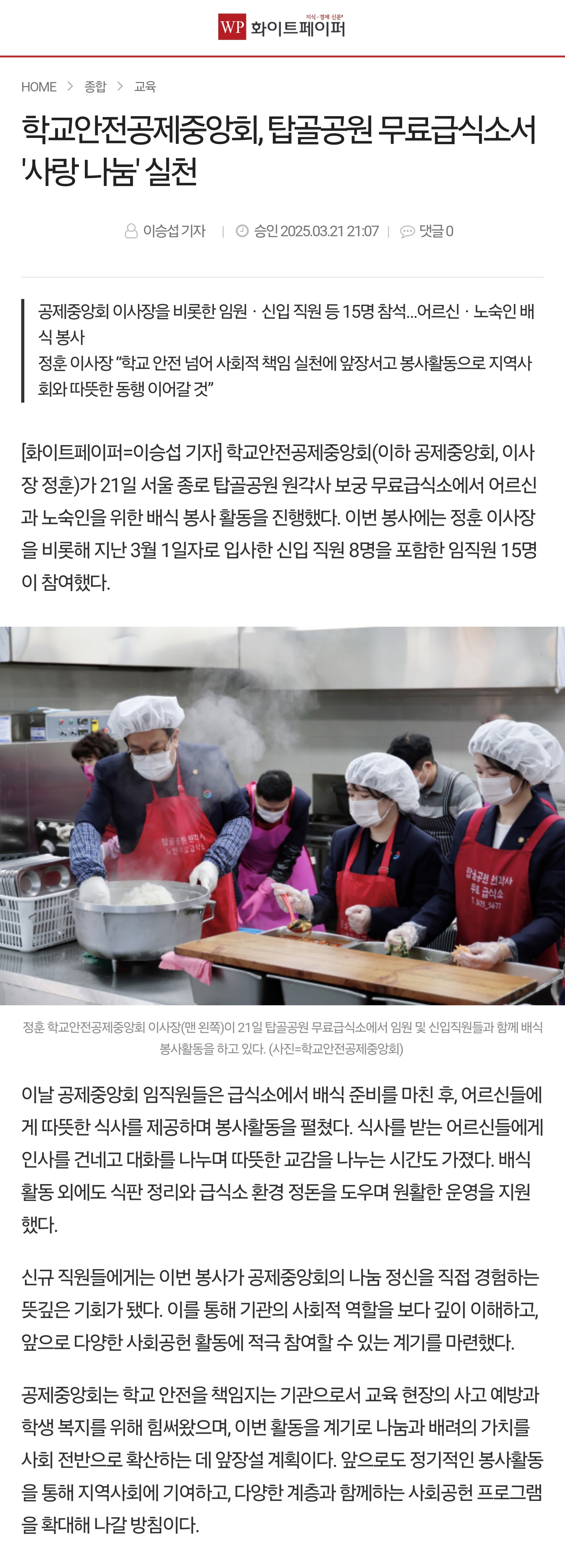 □ [화이트페이퍼] (2025.3.21.) 학교안전공제중앙회, 탑골공원 무료급식소서 '사랑 나눔' 실천 https://www.whitepaper.co.kr/news/articleView.html?idxno=244456