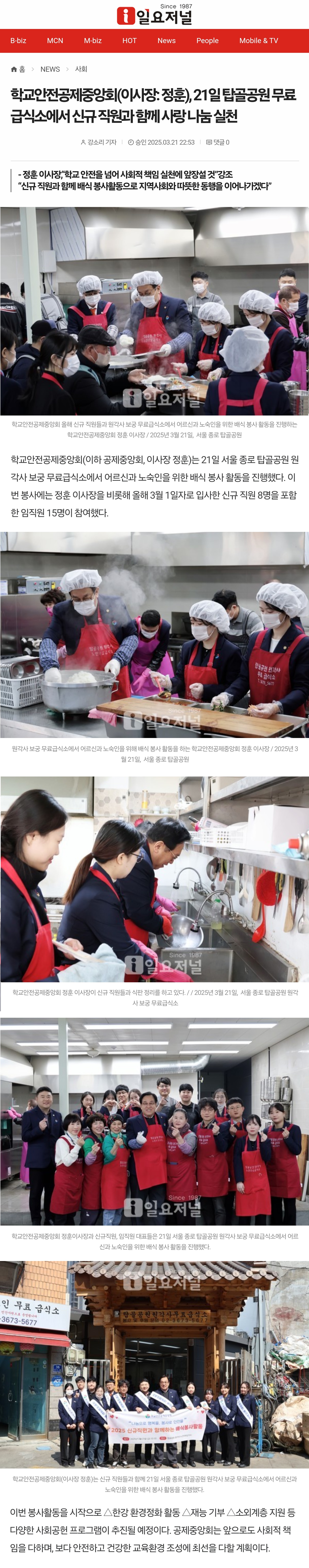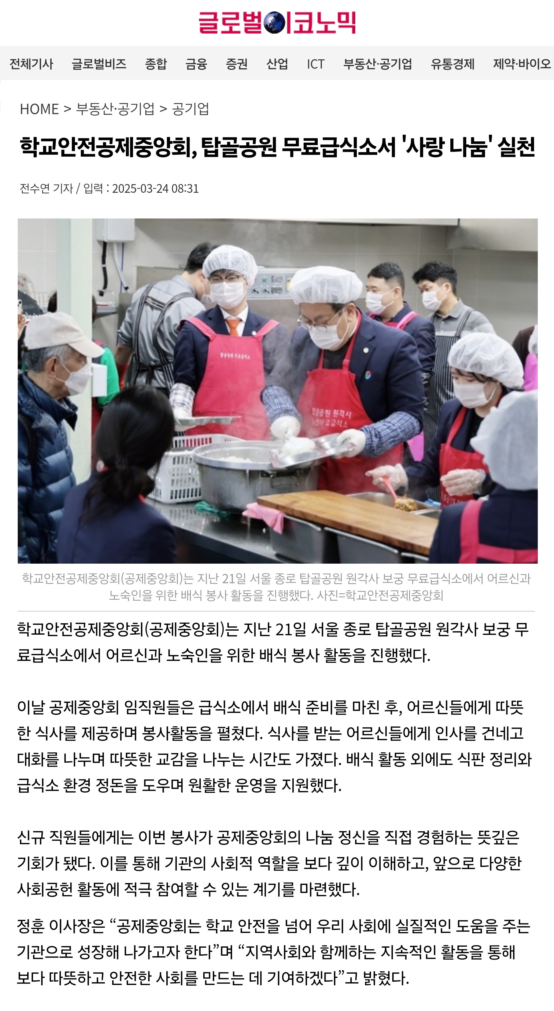 □ [글로벌이코노믹] (2025.3.24.) 학교안전공제중앙회, 탑골공원 무료급식소서 '사랑 나눔' 실천 https://www.g-enews.com/article/Real-Estate/2025/03/20250324082953513a9fc143920_1