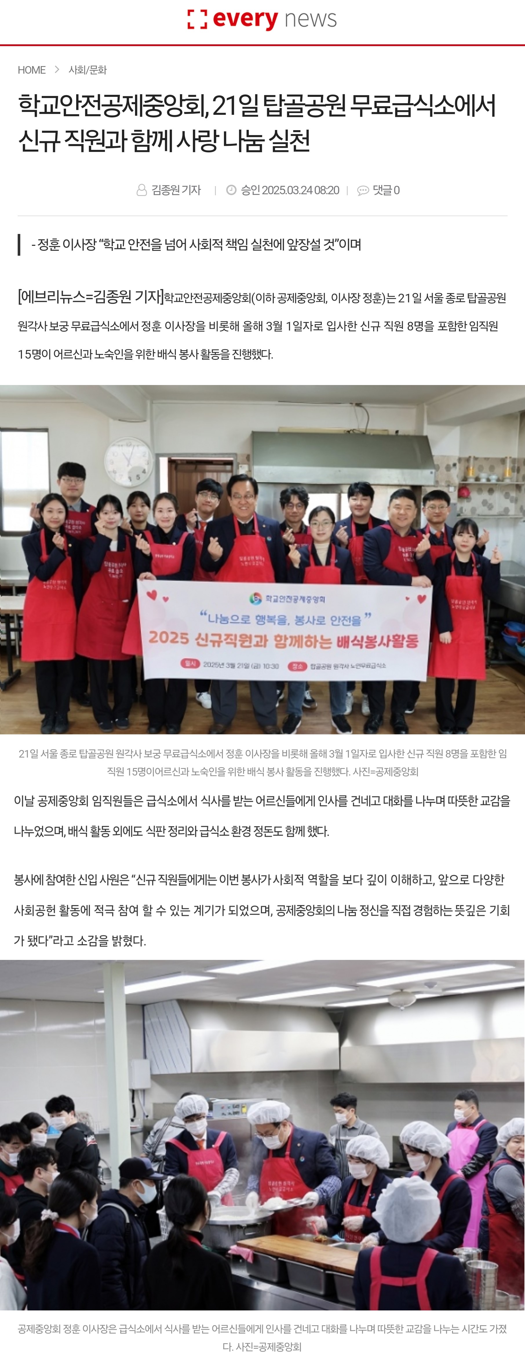 □ [에브리뉴스] (2025.3.21.) 학교안전공제중앙회, 21일 탑골공원 무료급식소에서 신규 직원과 함께 사랑 나눔 실천 https://www.everynews.co.kr/news/articleView.html?idxno=45884