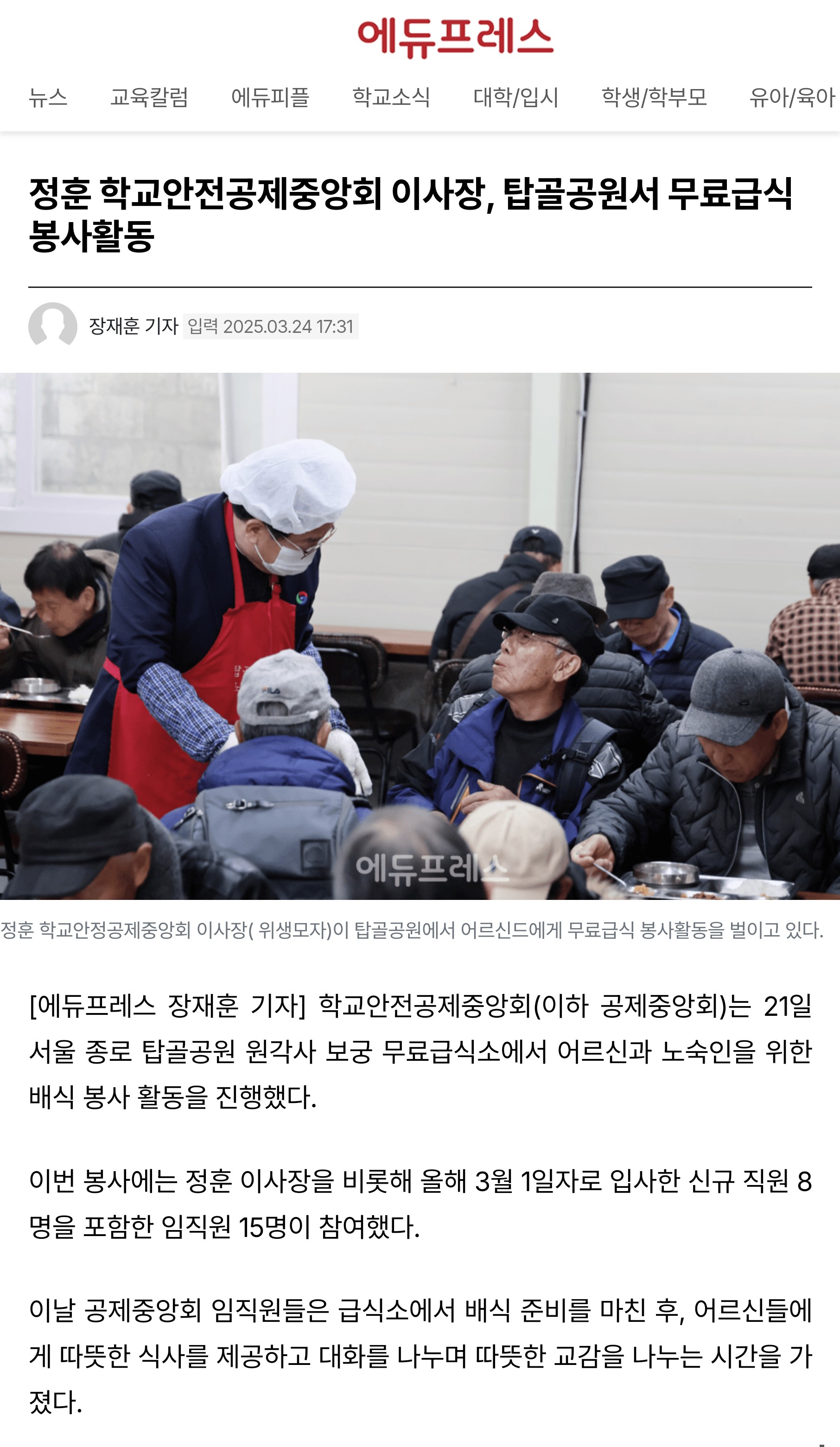 □ [에듀프레스] (2025.3.24.) 정훈 학교안전공제중앙회 이사장, 탑골공원서 무료급식 봉사활동 https://www.edupress.kr/news/articleView.html?idxno=20481