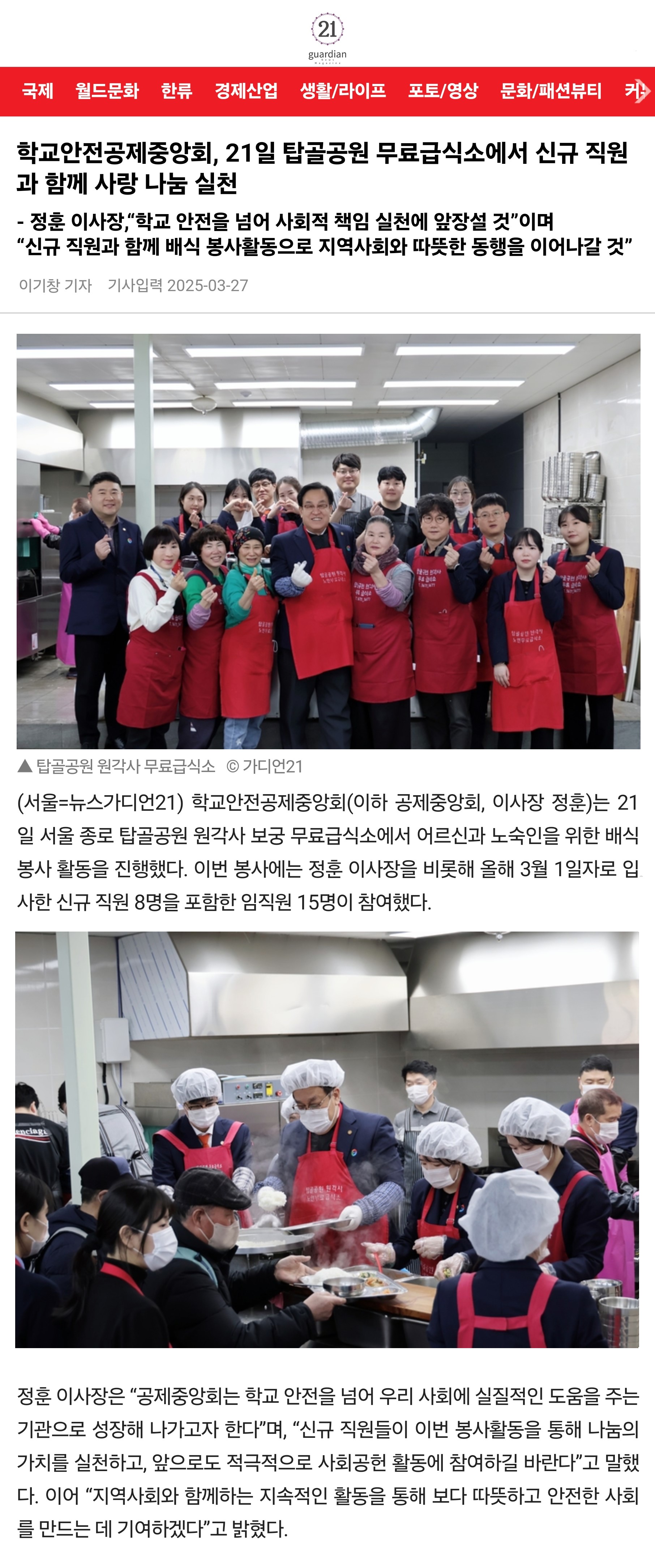 □ [가디언21] (2025.3.24.) 학교안전공제중앙회, 21일 탑골공원 무료급식소에서 신규 직원과 함께 사랑 나눔 실천 https://www.guardian21.co.kr/80794