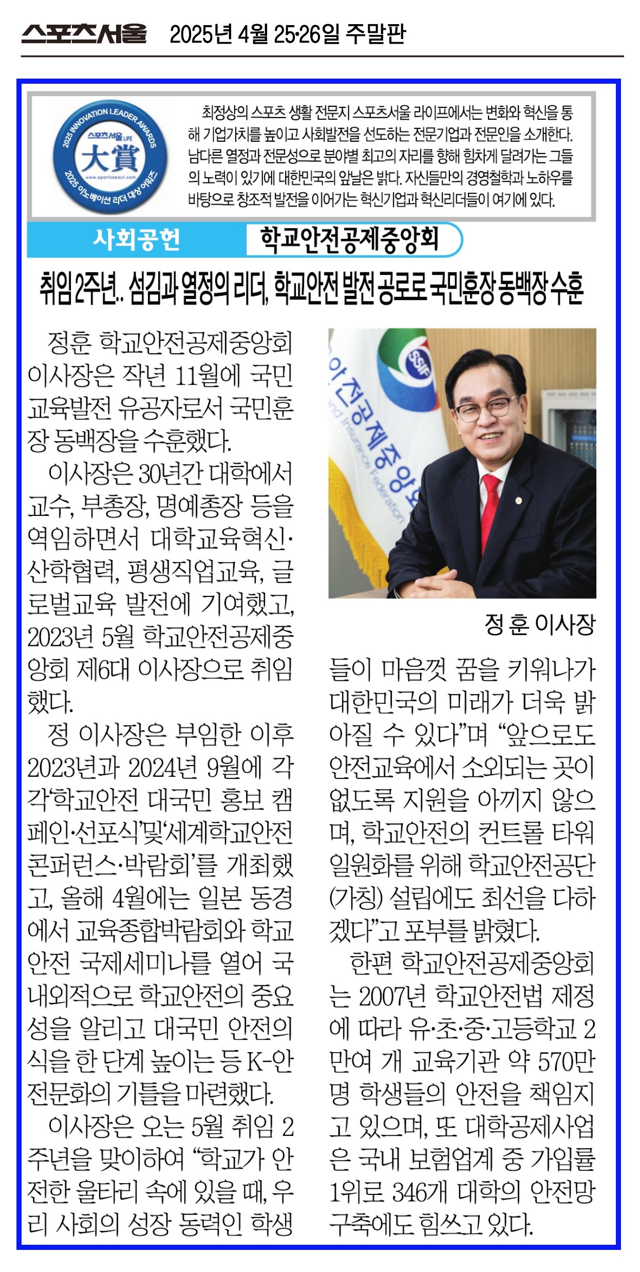 1. 학교안전공제중앙회 정훈 이사장, 2025 스포츠서울 이노베이션 리더 사회공헌 부문 대상