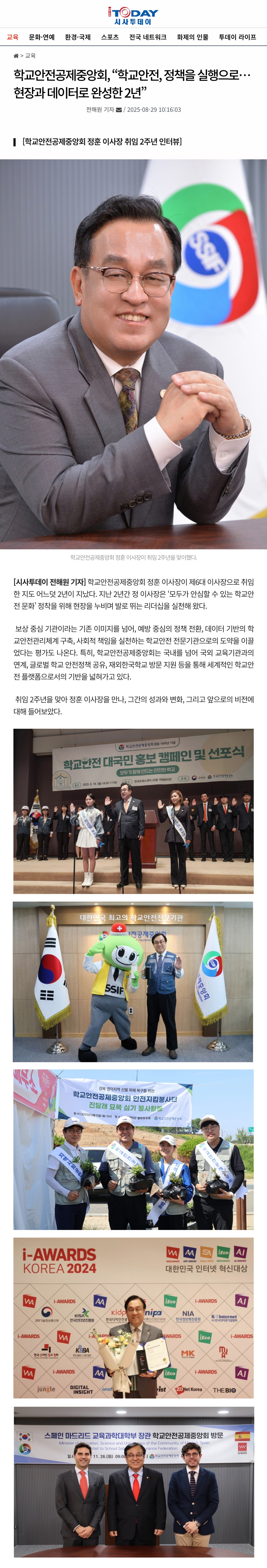 ○ (2025.8.29.) 학교안전공제중앙회, “학교안전, 정책을 실행으로… 현장과 데이터로 완성한 2년” https://sisatoday.co.kr/article/1065575801921418
