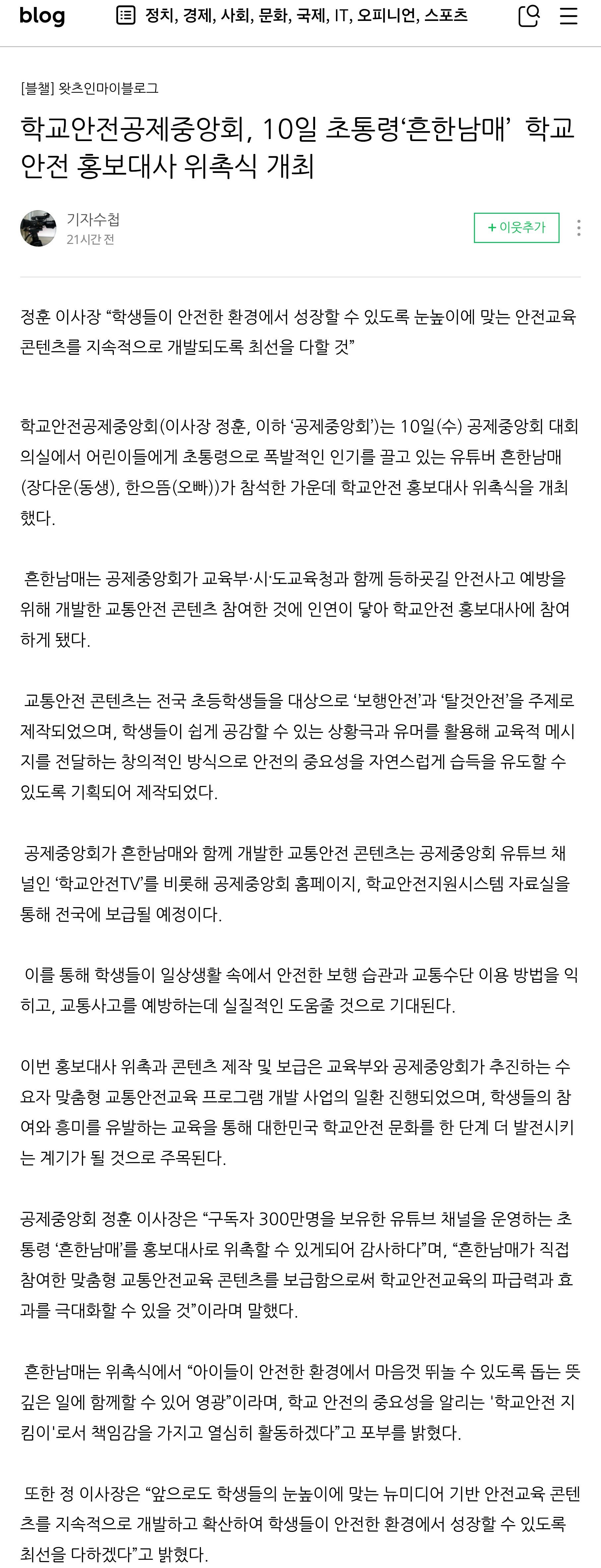 □ [기자수첩] (2025.12.11.) 학교안전공제중앙회, 10일 초통령‘흔한남매’ 학교안전 홍보대사 위촉식 개최 https://m.blog.naver.com/enhanok70/224105776742