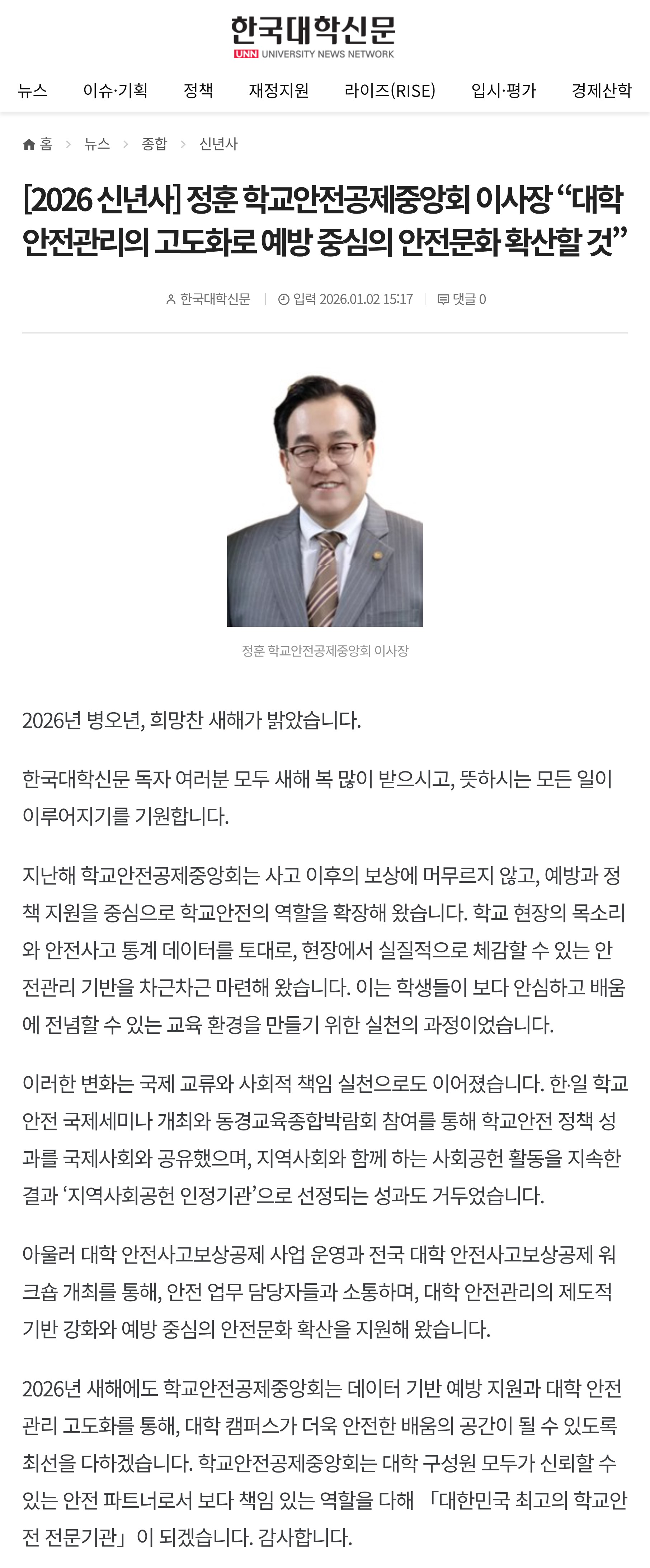 □ [한국대학신문] (2026.1.2.) [2026 신년사] 정훈 학교안전공제중앙회 이사장 “대학 안전관리의 고도화로 예방 중심의 안전문화 확산할 것” https://news.unn.net/news/articleView.html?idxno=588103