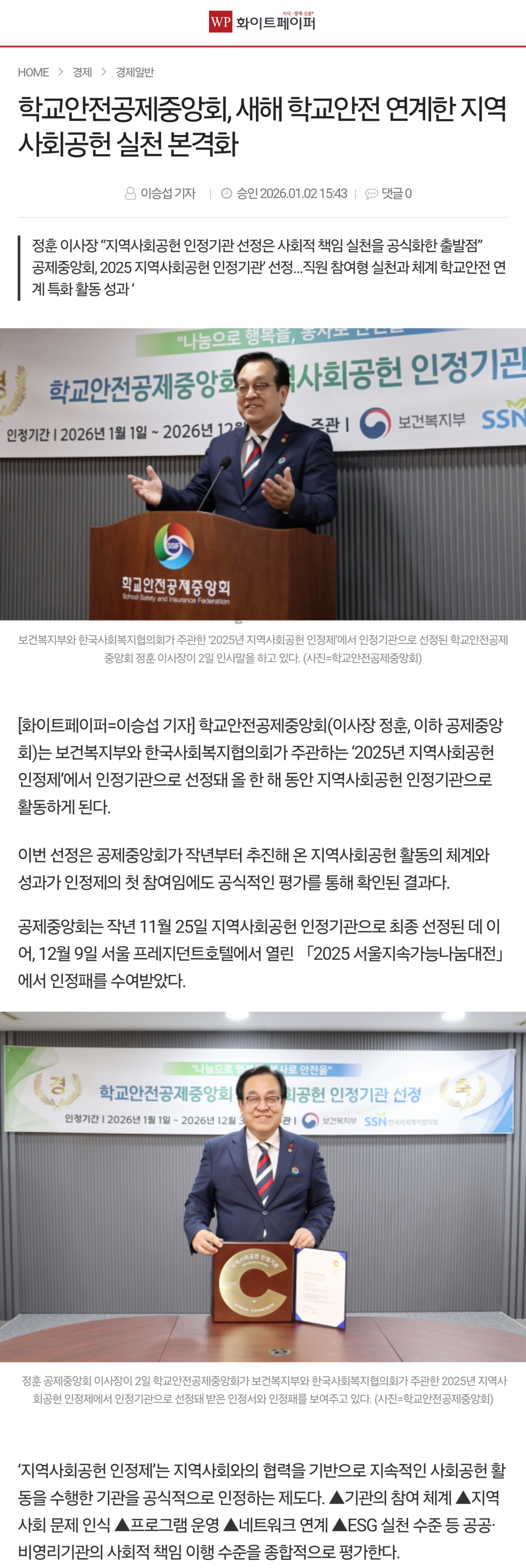 □ [화이트페이퍼] (2026.1.2.) 학교안전공제중앙회, 새해 학교안전 연계한 지역사회공헌 실천 본격화 https://www.whitepaper.co.kr/news/articleView.html?idxno=256472