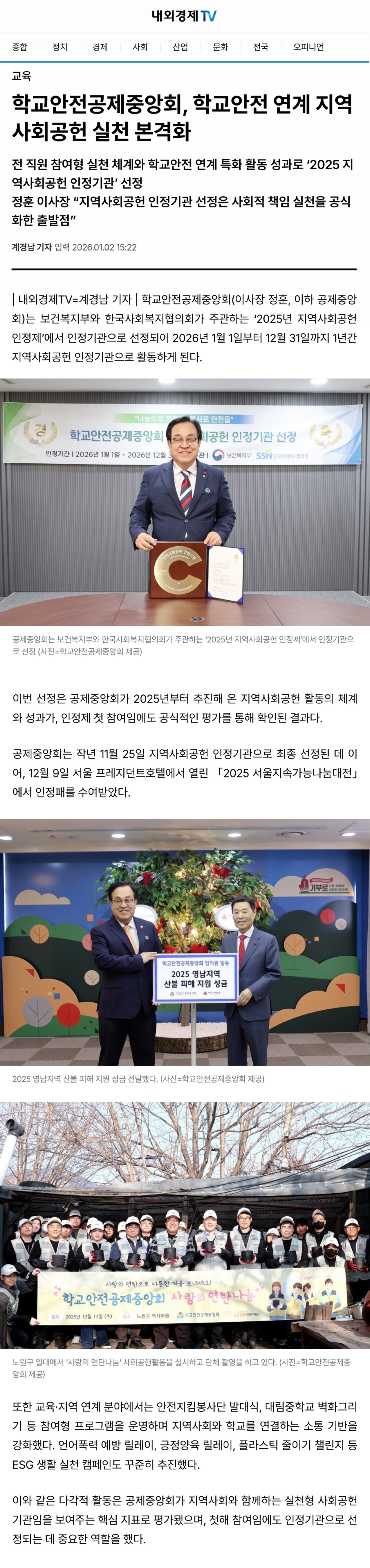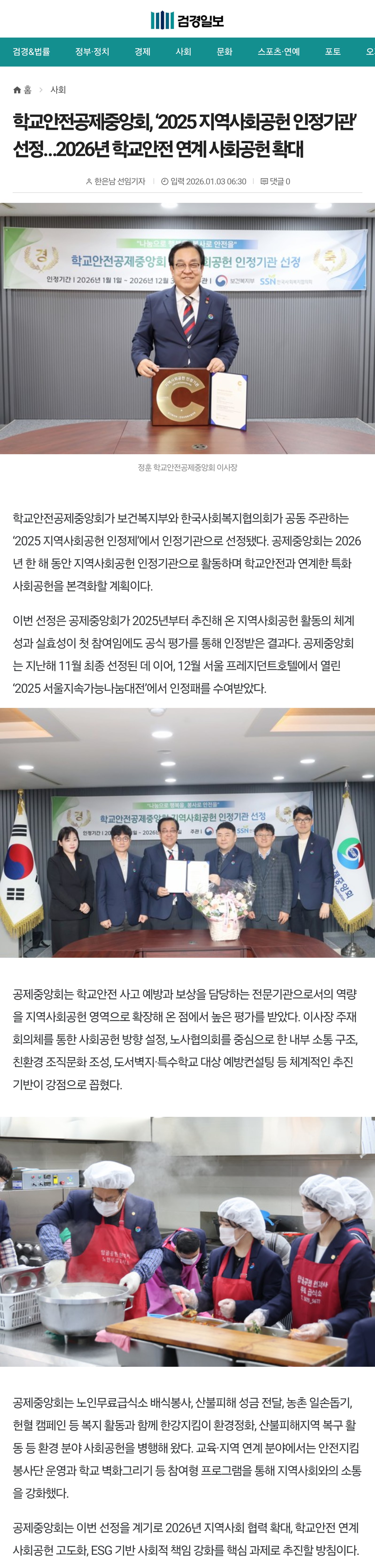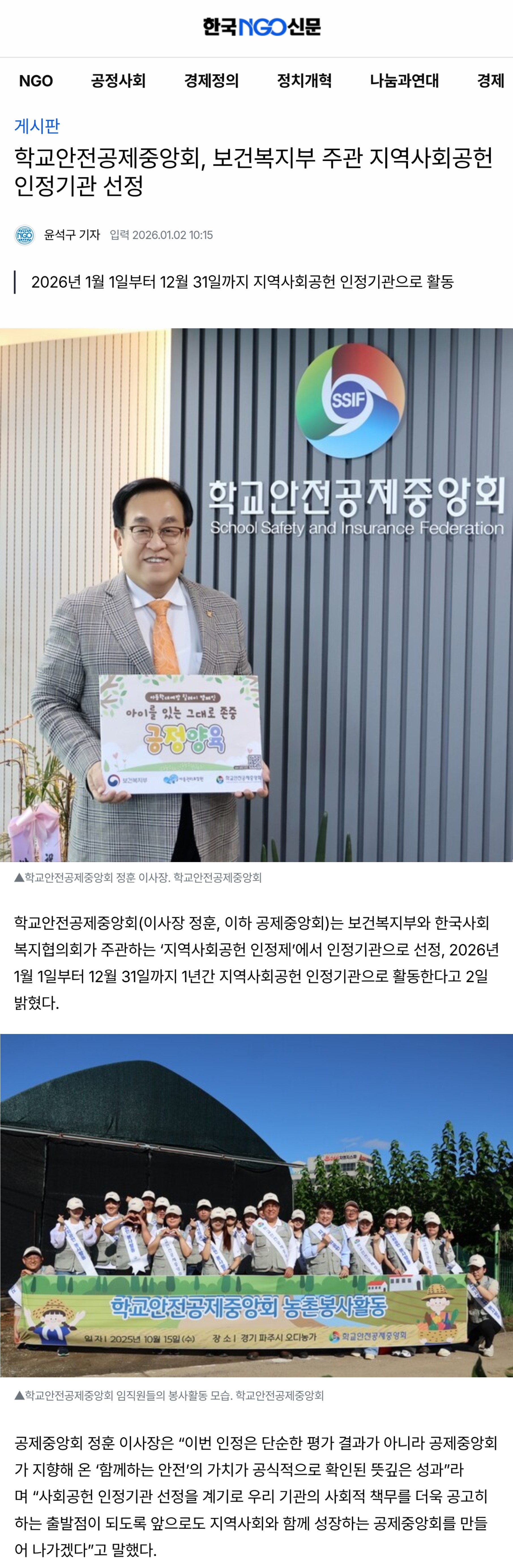 □ [한국NGO신문] (2026.1.2.) 학교안전공제중앙회, 보건복지부 주관 지역사회공헌 인정기관 선정 https://www.ngonews.kr/news/articleView.html?idxno=221719