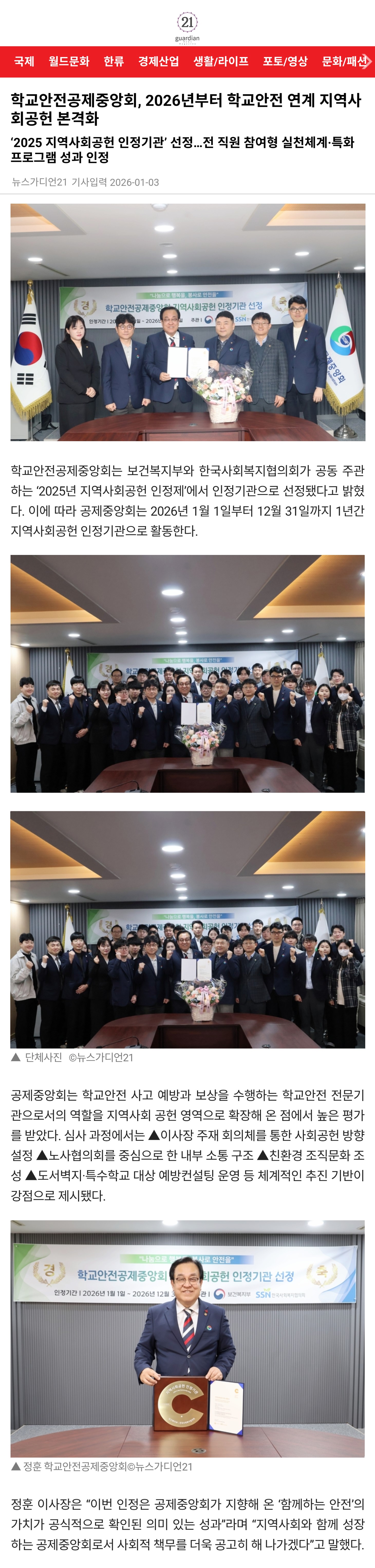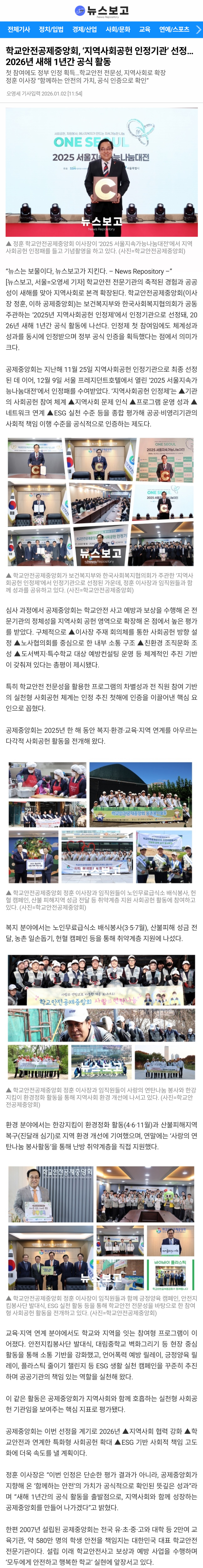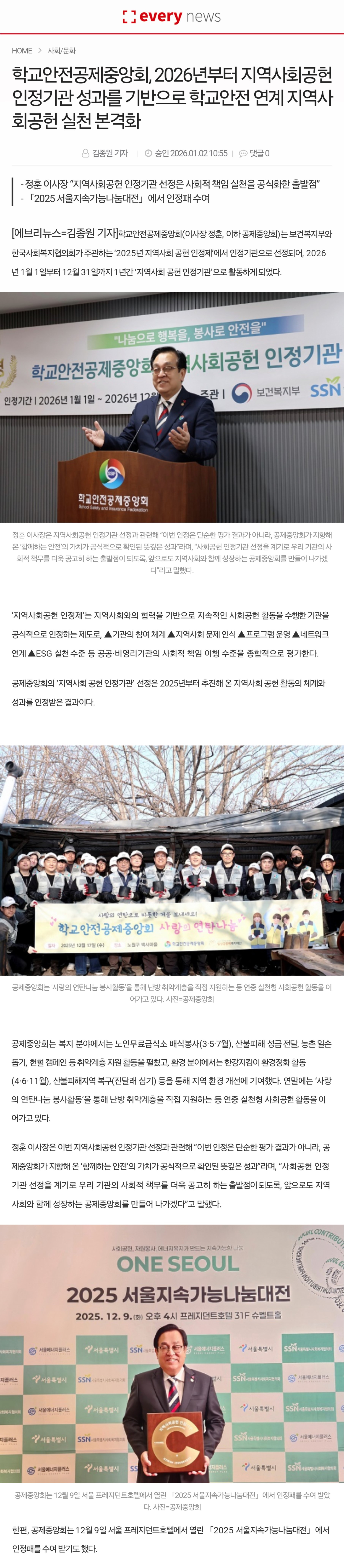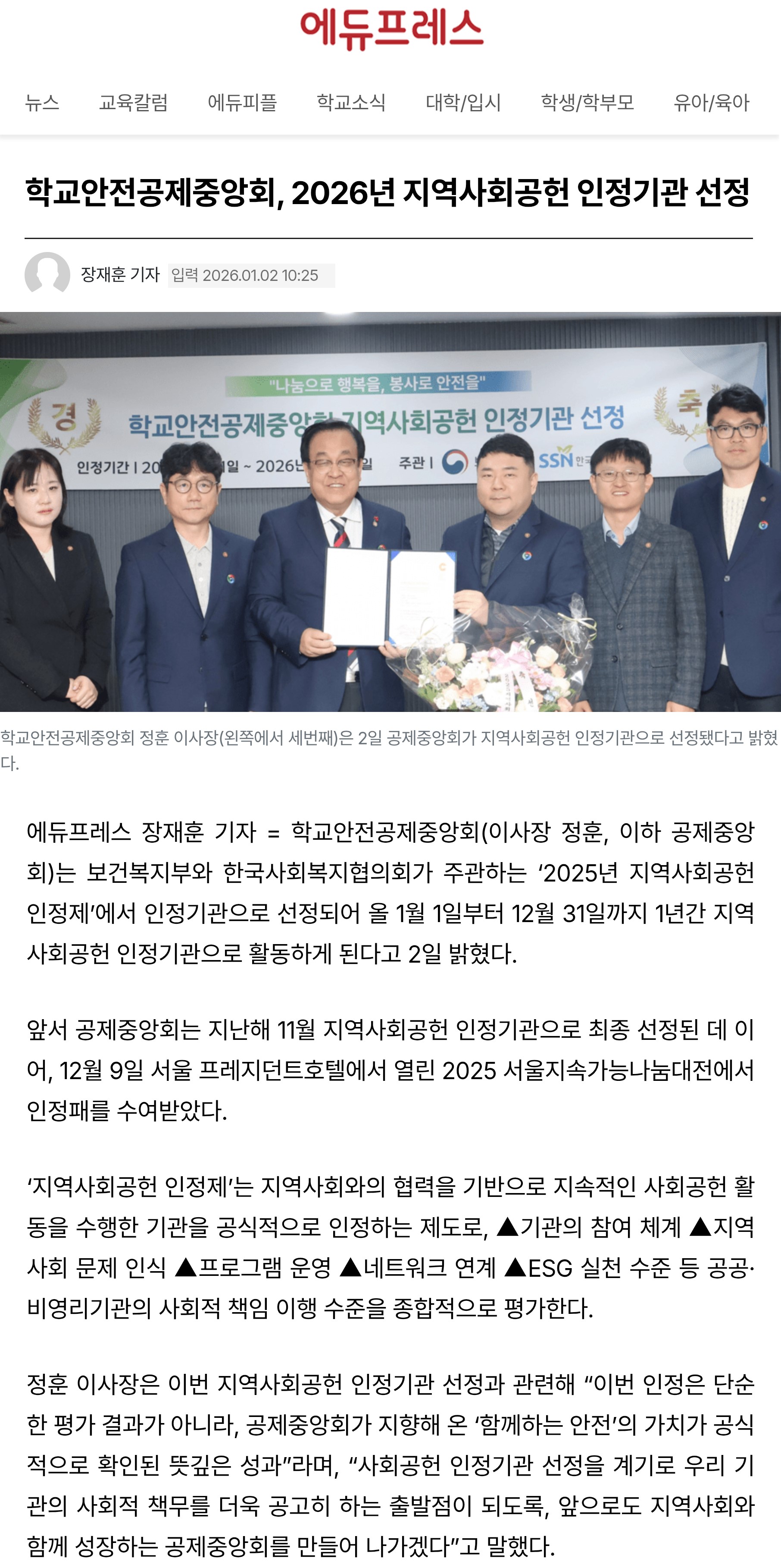 □ [한국NGO신문] (2026.1.2.) 학교안전공제중앙회, 보건복지부 주관 지역사회공헌 인정기관 선정 https://www.ngonews.kr/news/articleView.html?idxno=221719