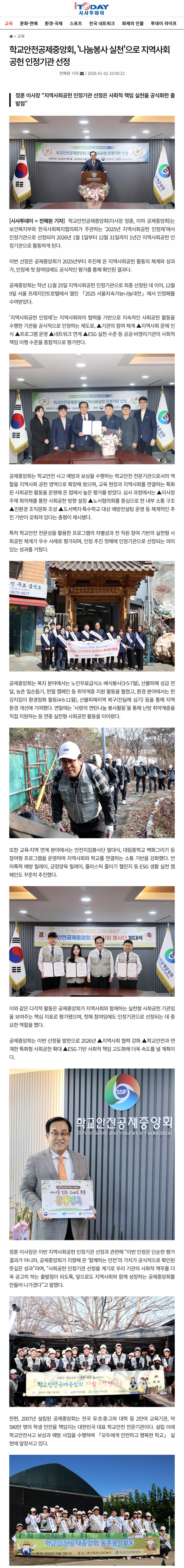 □ [시사투데이] (2026.1.2.) 학교안전공제중앙회, '나눔봉사 실천'으로 지역사회공헌 인정기관 선정 https://sisatoday.co.kr/article/1065574848474936