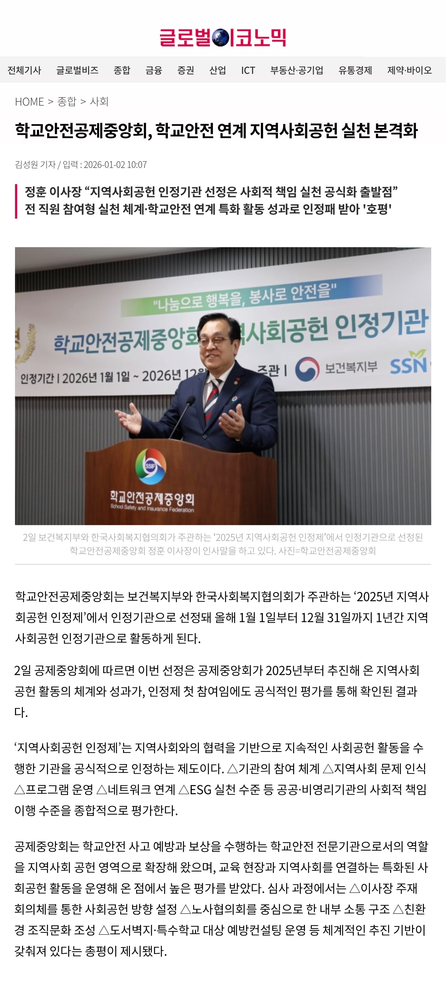 □ [웹이코노믹] (2026.1.2.) 학교안전공제중앙회, 2026년부터 지역사회공헌 인정기관 실천 본격화 https://www.webeconomy.co.kr/news/articleView.html?idxno=2045113