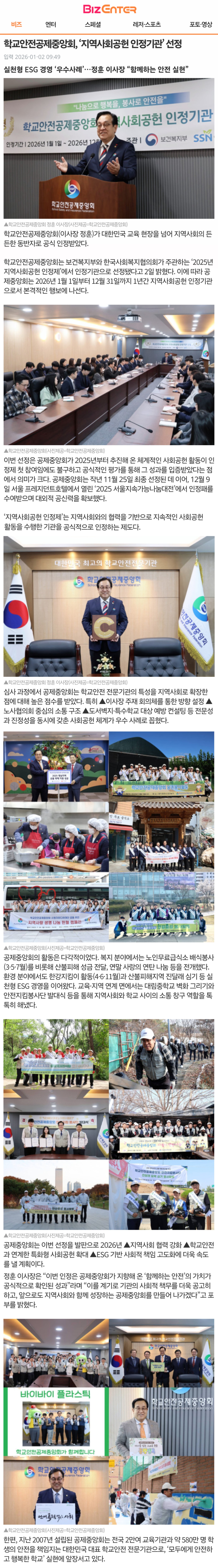 □ [비즈엔터] (2026.1.2.) 학교안전공제중앙회, ‘지역사회공헌 인정기관’ 선정 https://enter.etoday.co.kr/news/view/290674