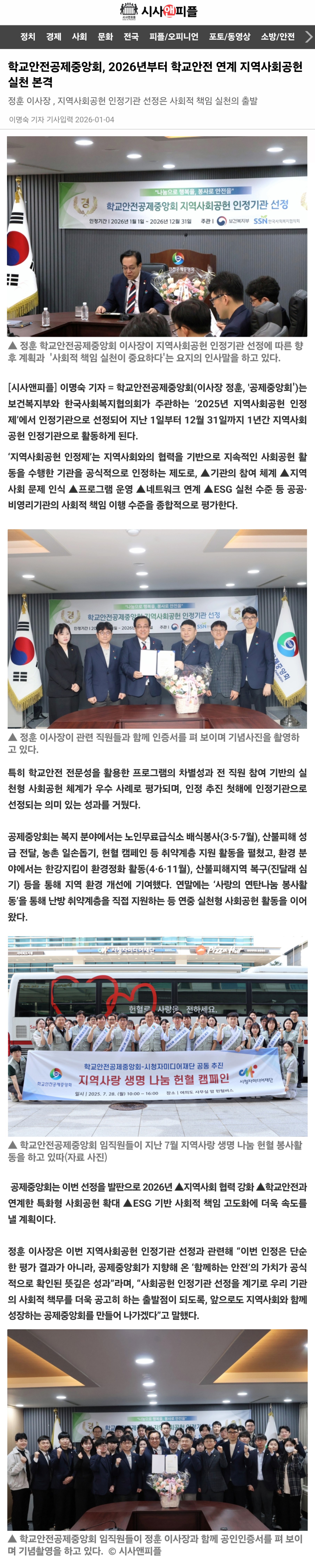 □ [시사앤피플] (2026.1.4.) 학교안전공제중앙회, 2026년부터 학교안전 연계 지역사회공헌 실천 본격 https://www.sisanpeople.com/13539