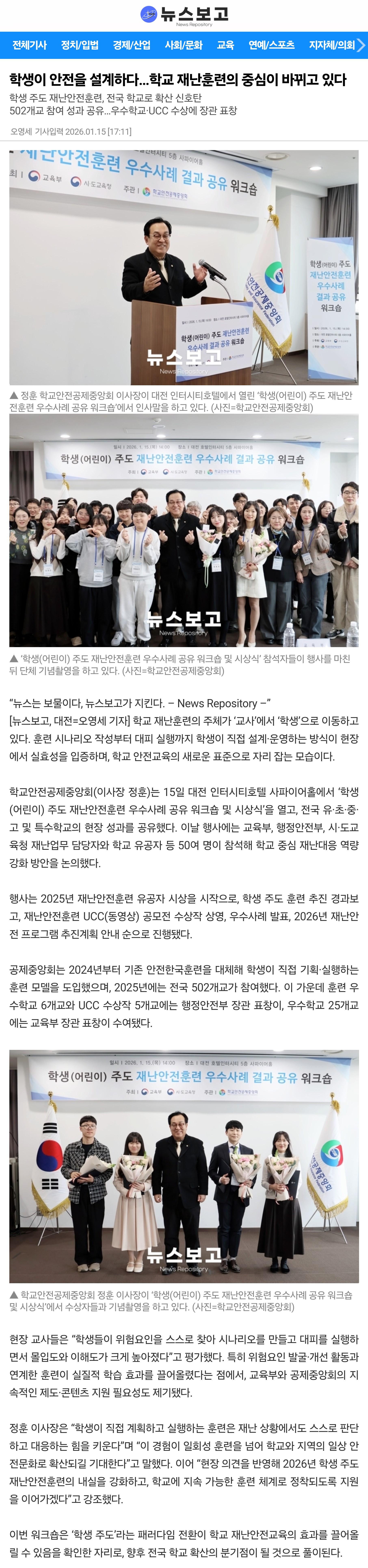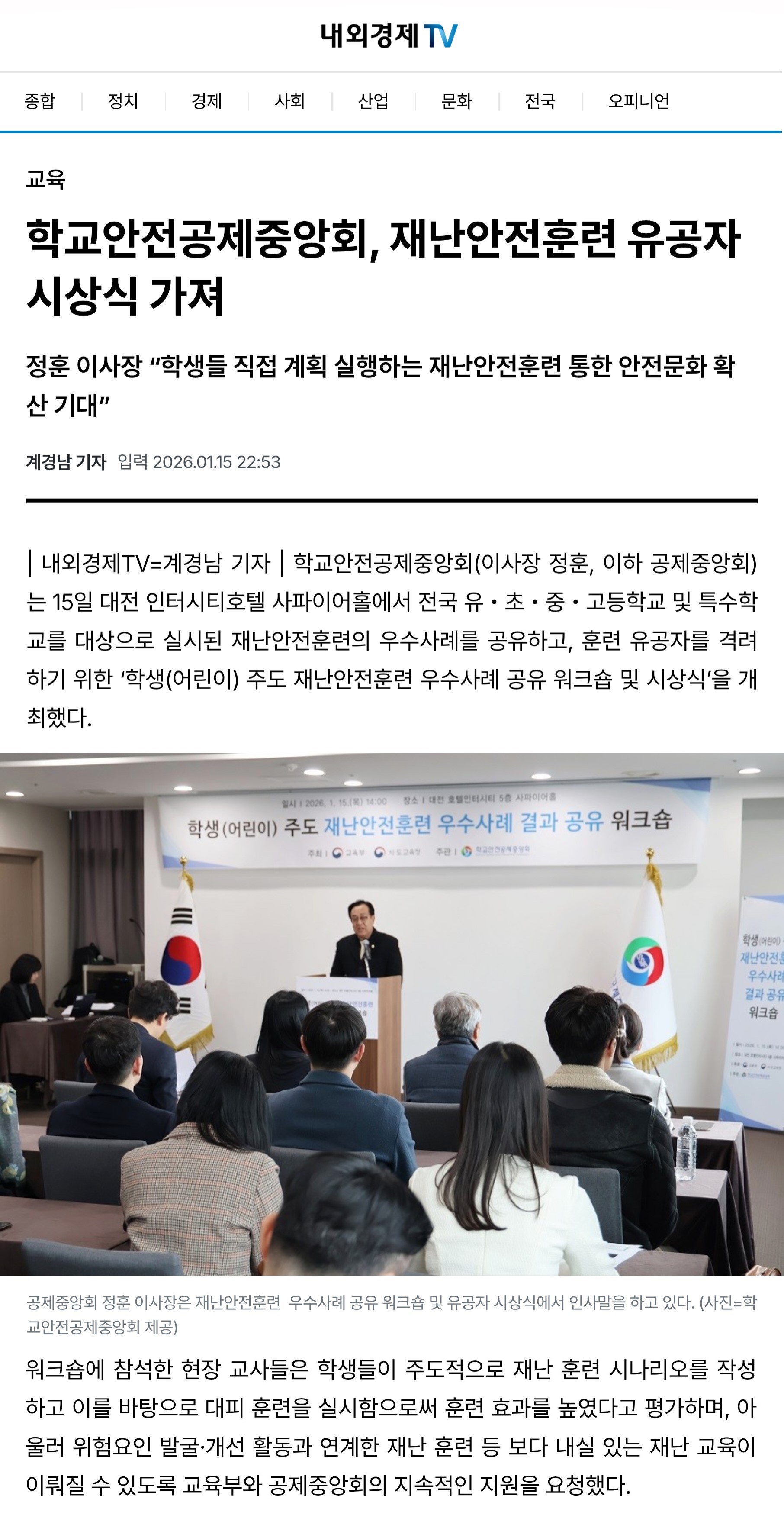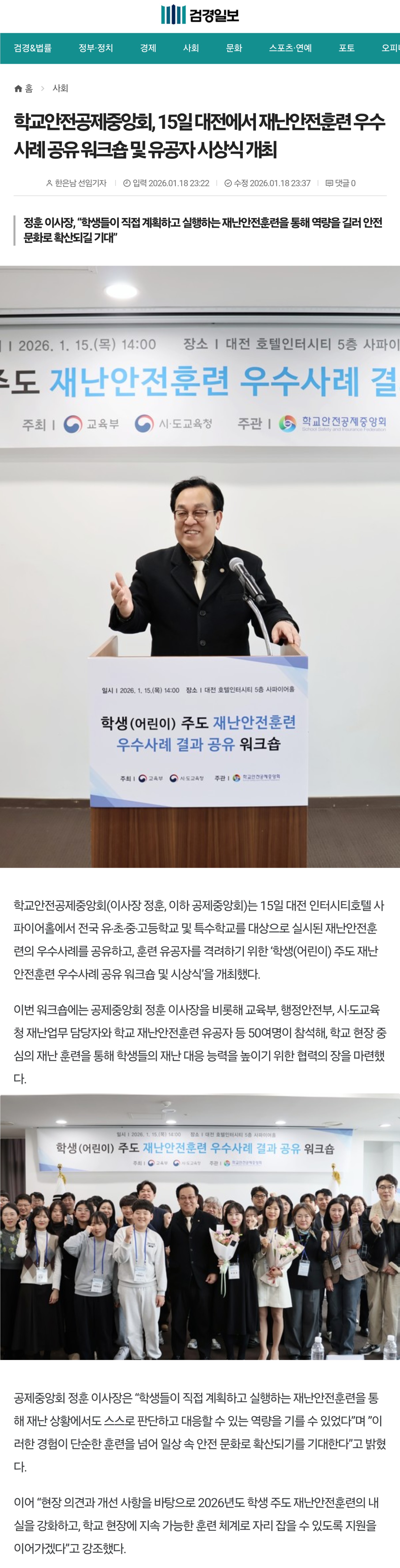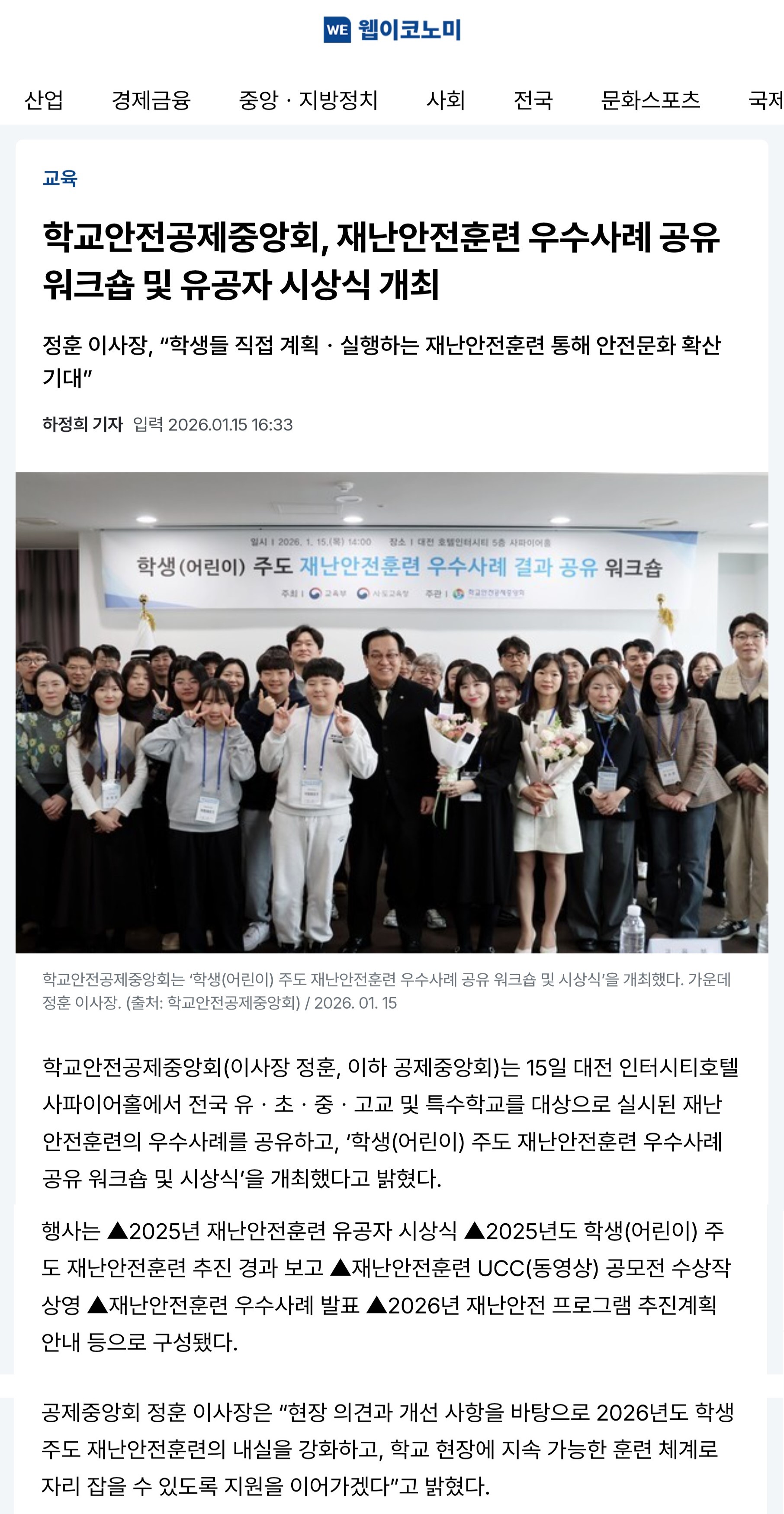 □ [웹이코노믹] (2026.1.15.) 학교안전공제중앙회, 재난안전훈련 우수사례 공유 워크숍 및 유공자 시상식 개최 https://www.webeconomy.co.kr/news/articleView.html?idxno=2049229