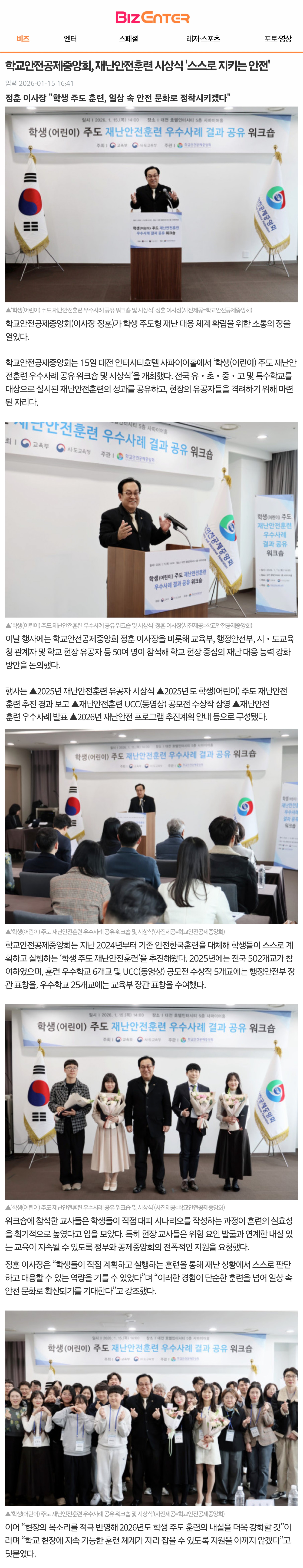 □ [비즈엔터] (2026.1.15.) 학교안전공제중앙회, 재난안전훈련 시상식 '스스로 지키는 안전' https://enter.etoday.co.kr/news/view/291422