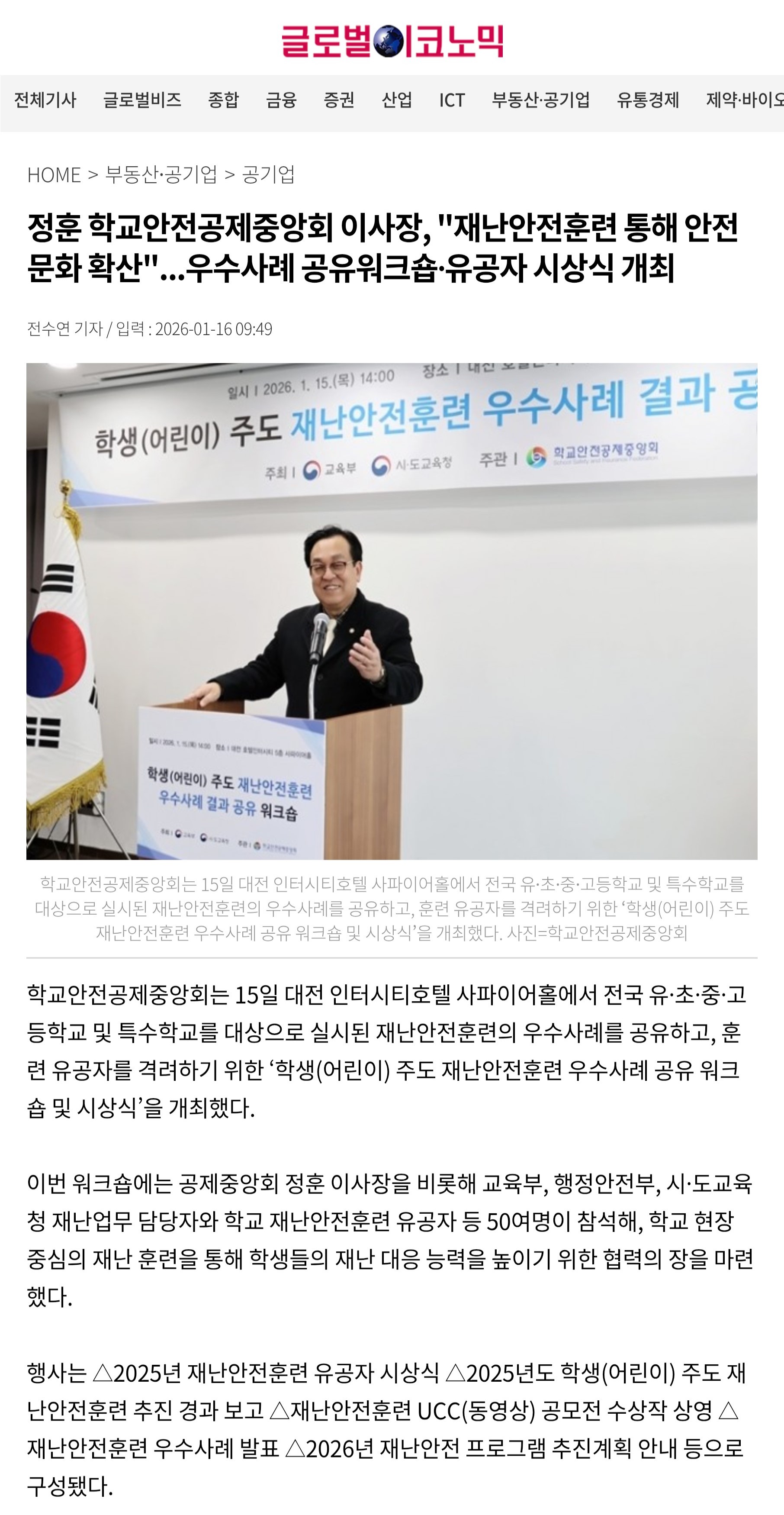□ [글로벌이코노믹] (2026.1.16.) 정훈 학교안전공제중앙회 이사장, "재난안전훈련 통해 안전문화 확산"...우수사례 공유워크숍·유공자 시상식 개최 https://m.g-enews.com/view.php?ud=202601160948293889a9fc143920_1