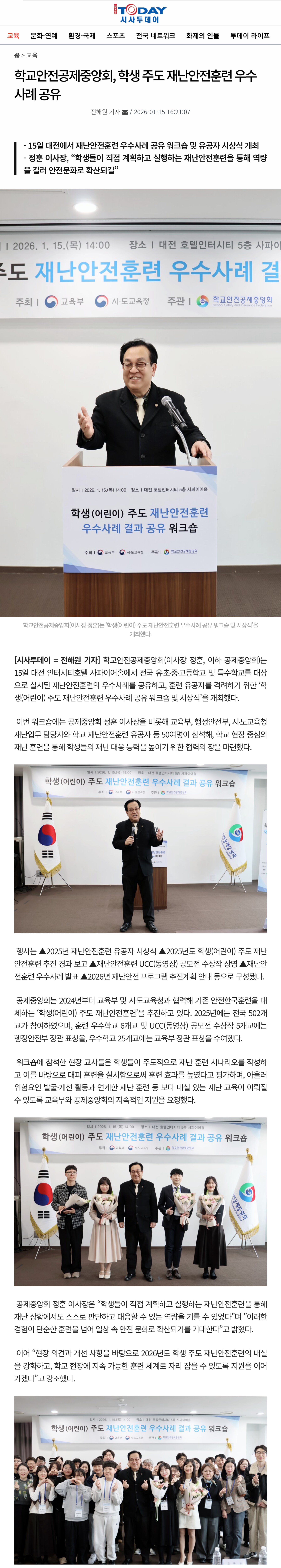 □ [시사투데이] (2026.1.15.) 학교안전공제중앙회, 학생 주도 재난안전훈련 우수사례 공유 https://sisatoday.co.kr/article/1065597694181953