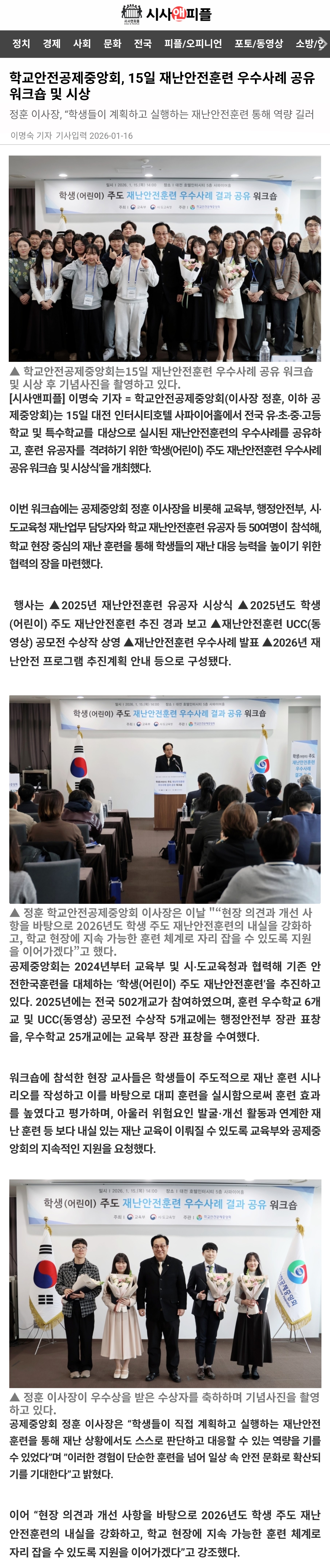 □ [시사앤피플] (2026.1.16.) 학교안전공제중앙회, 15일 재난안전훈련 우수사례 공유 워크숍 및 시상 https://www.sisanpeople.com/13687